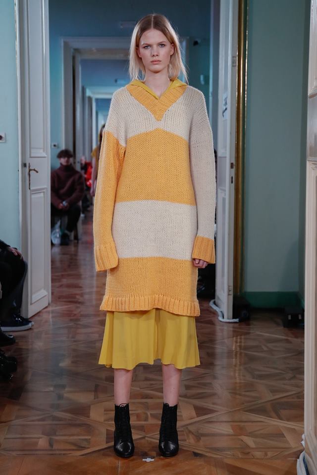Denisa Nová’s collections are usually in the spirit of wearable fashion and natural and classic tones. But she decided to include more distinctive colours such as yellow, orange and red, as well as the standard cream, nude, white, black and grey, in her FW 18 collection. In spite of this, her models from the autumn collection are among the simpler ones and she left the opportunity to creatively cut loose to other designers.