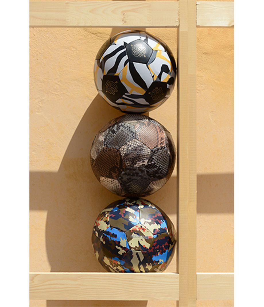 Footballs by designer Roberto Cavalli are made, what else, from luxury materials, including genuine leather or exotic python leather. Individual balls are covered by very daring graphic prints that mimic smooth snake skin, luxurious leopard or refined cheetah fur. All patterns are reminiscent of wild fauna. If that tells you something, you are on the right track. In fact, these types of soccer balls reflect the Cavalli SS19 collection.