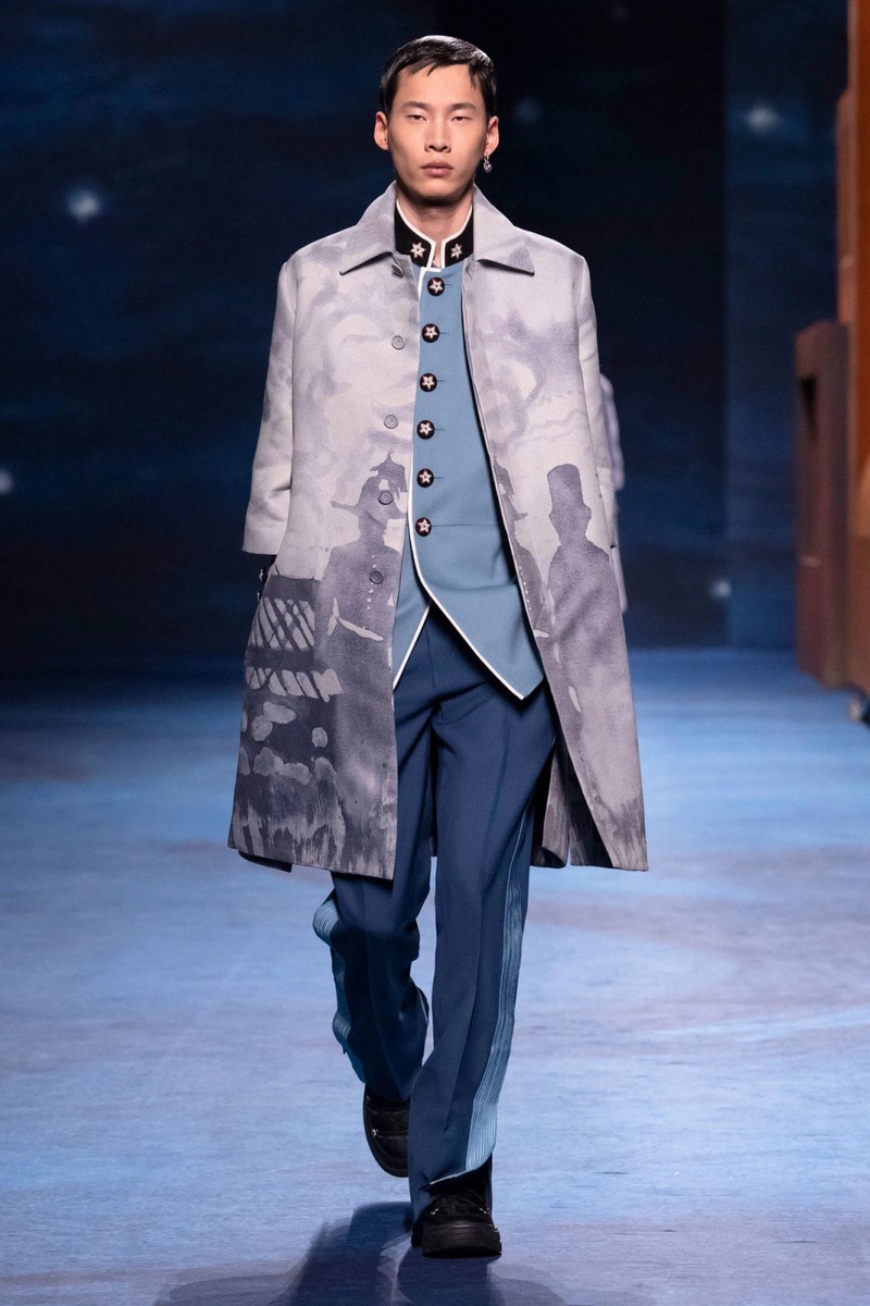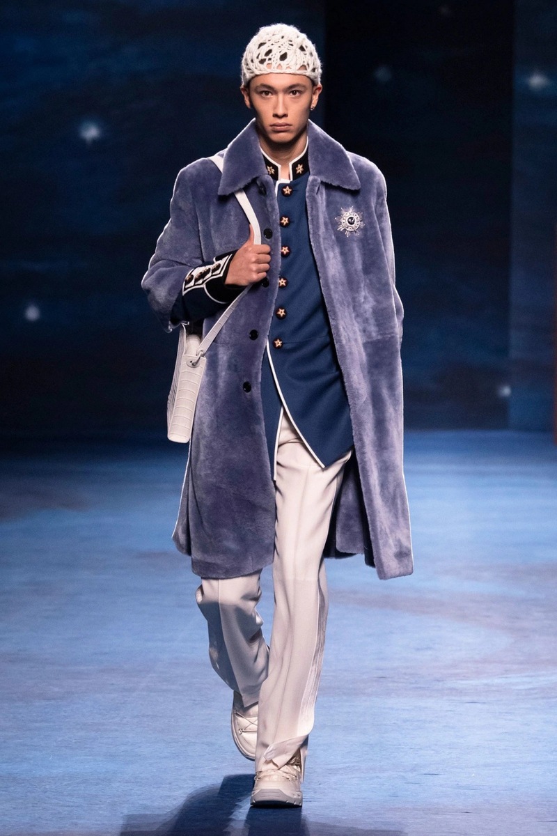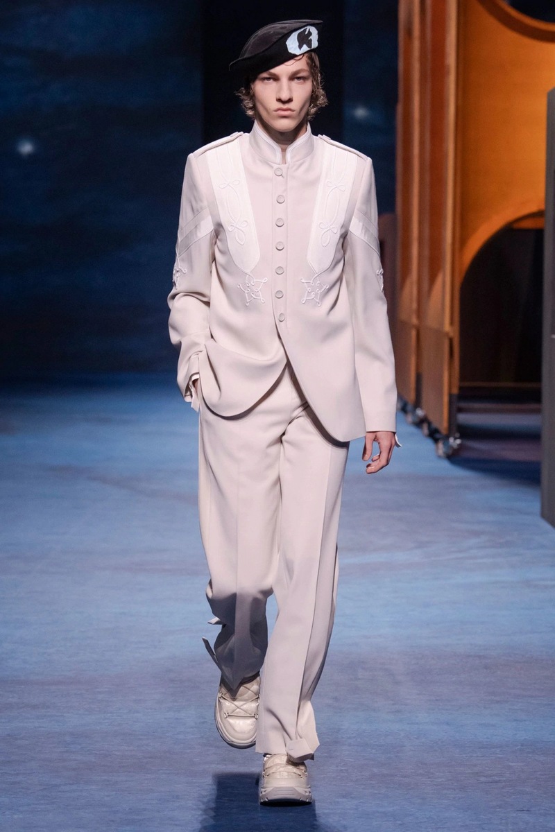The new Dior collection combines inspiration, drawn from the heritage and history of the fashion house, with extravagance. Kim Jones brings trendy uniforms with embroidery and embellishments, inspired mainly by the Académie des Beaux-Arts (male interpretation of couture). The inspiration by army style is obvious at first glance, and in addition to uniforms, the collection also includes trousers with stripes on the sides or trousers tucked into shoes, a camouflage print - in a new and more luxurious design, or badges.