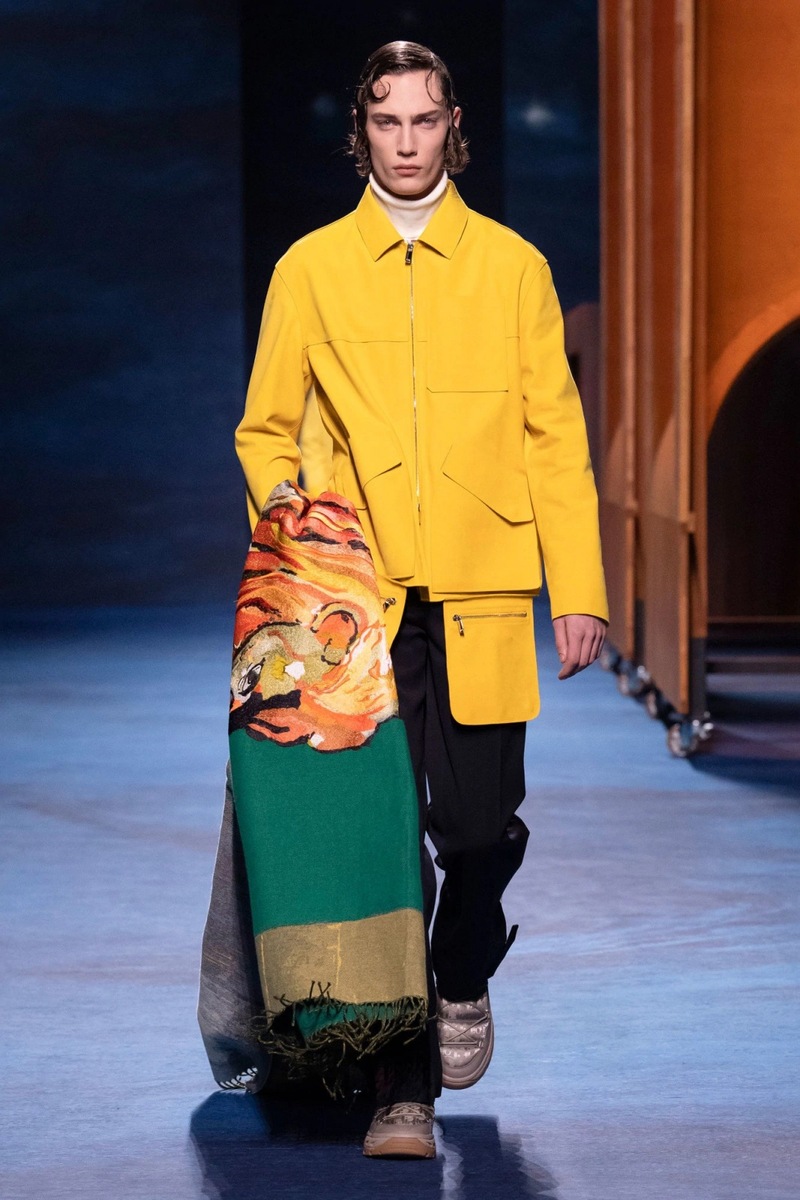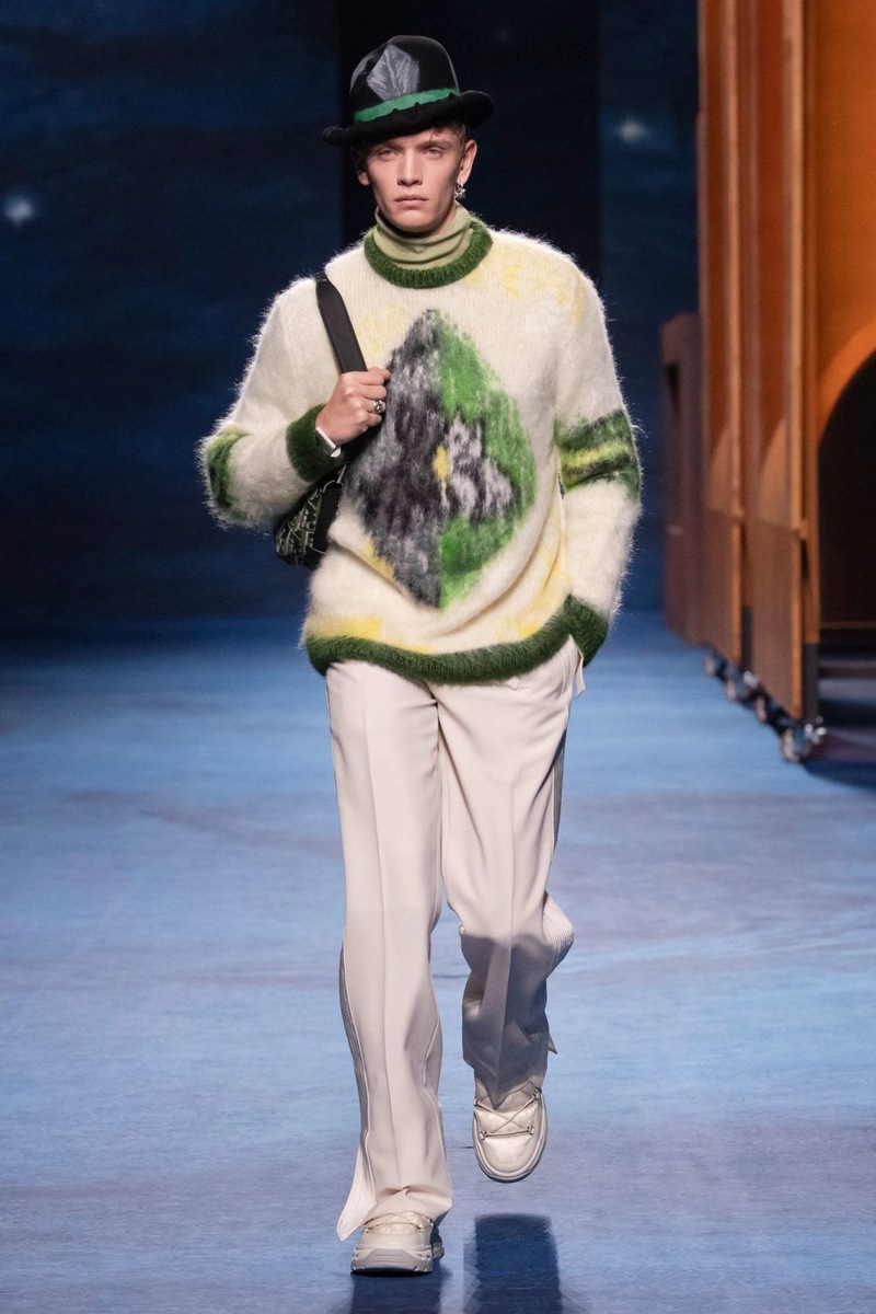In 2018, however, there was a sharp turnaround. Kim Jones took the position of the creative director and things started to happen! The catwalk was suddenly dominated by animal patterns, metallic shades, gloss, berets and even velvet gloves. Kim Jones definitely brings new energy and ideas to this fashion house. And this year is no different. He also hired the Scottish artist Peter Doig, who's lived in Trinidad for almost 20 years.