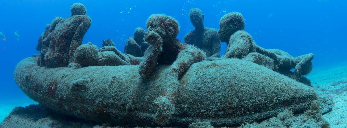 What will you be able to see on the bottom of the Atlantic Ocean? Los Jolateras is a group of children in small brass boats. You can also see the famous Raft of Lampedus, a reference to the current refugee crisis. There is a deluxe sculpture of couples called Rubikon, which consist of 35 human figures, statues. The models used for these statues are residents of Lanzarote. There are also several hybrid sculptures, half person - half cactus, which demonstrate the union between nature and humanity, existing together in harmony.