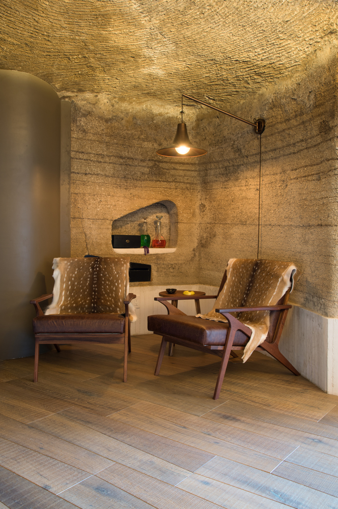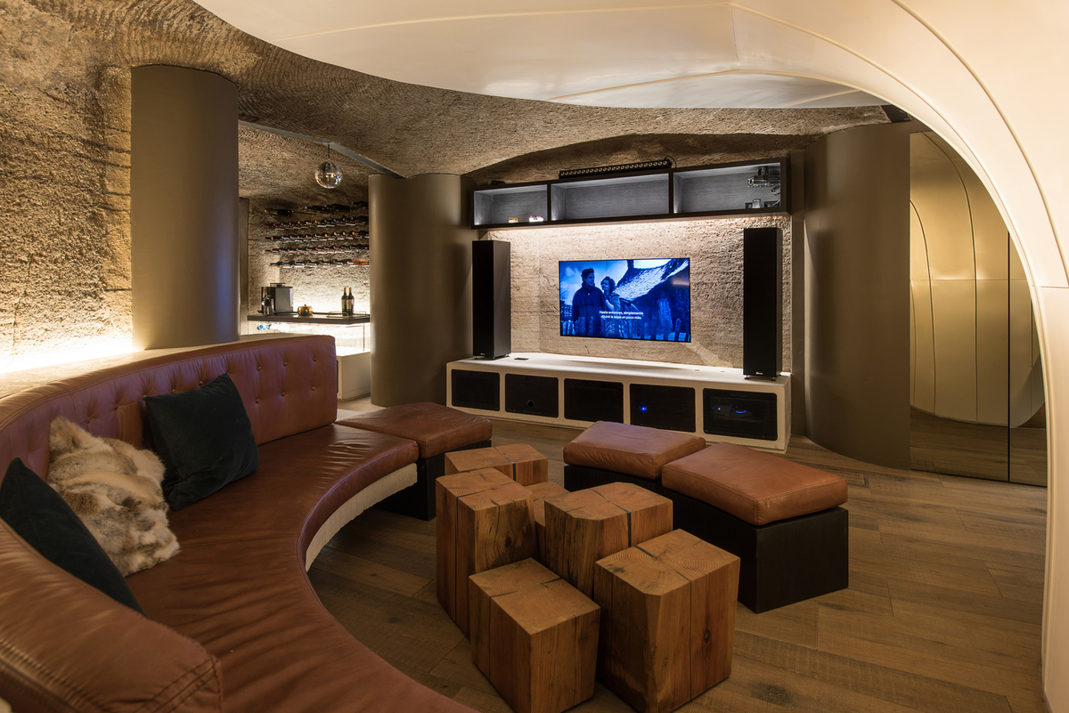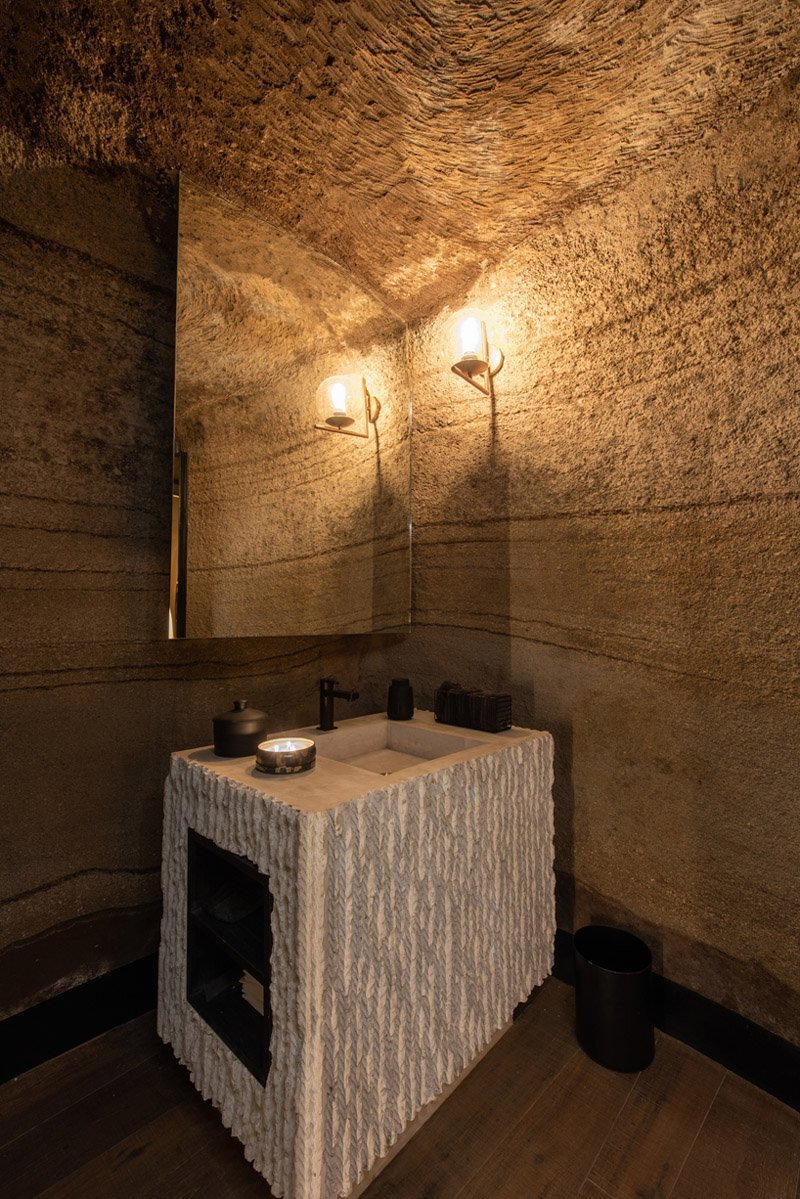 The cave residence covers 70 square meters and features five chambers. Each of them has a different function. One chamber contains a kitchen and a bar, while the adjoining space is a luxurious living room and media room. The third dedicated area boasts a dinette and a balcony. The fourth room has a wine cellar as well as an area reserved for smoking or sipping coffee. The last room is a bathroom, cleverly hidden behind the mirrored doors in the kitchen.