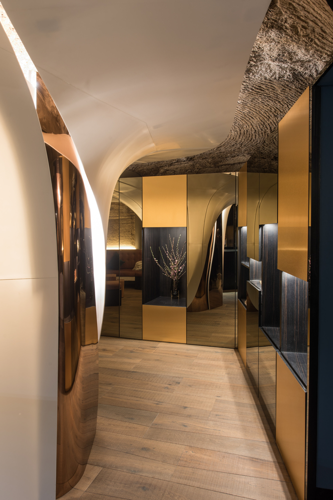 What used to be a dark, cold and damp cavity in a rock is now a warm, luxurious, pleasant place to live. Upon entering you won't even feel like you've just walked into a cave. At first glance you will find the space very atypical. It looks as if it were constantly in motion. Vaulted carved walls, glossy surfaces and the preservation of the rough structure of the cave itself contribute to this impression. The heart of the house is a giant flamboyant design element in the form of a calla flower. It is made of white Krion panels from a unique material that has photocatalytic properties. It is supposed to help scatter light and purify the air. The dominant glowing installation above the dining table works on the same principle.