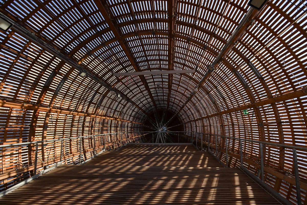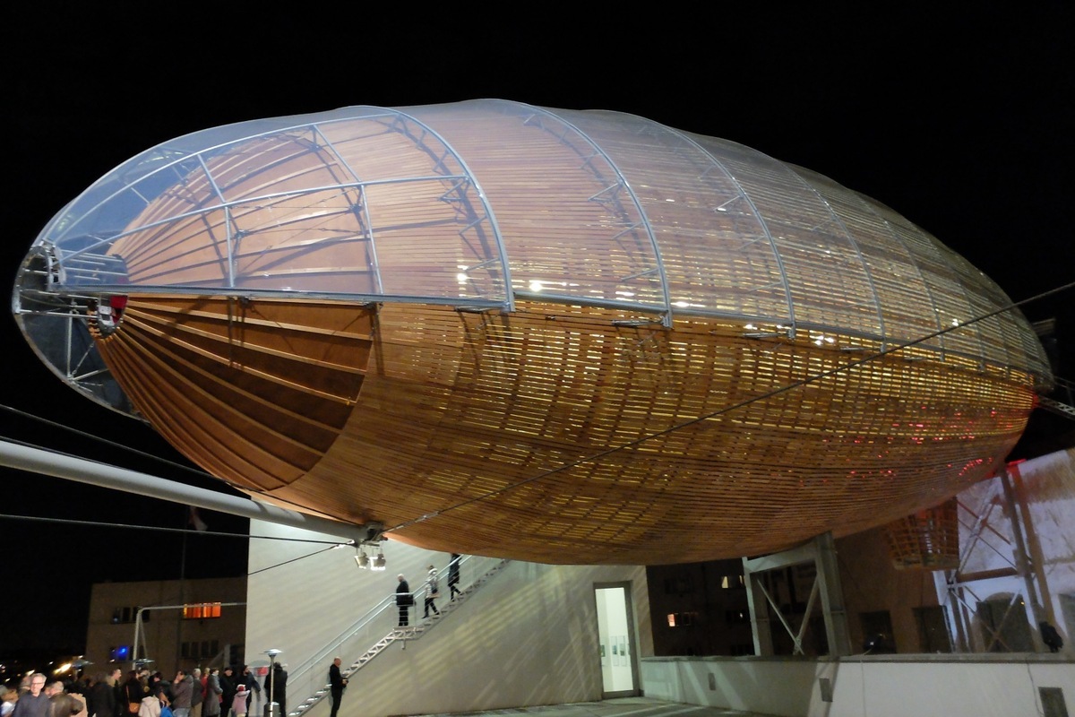 Over a total of three years of work, and with the aid specialists in creating structures from wood and steel, they managed to bring to life this structure which is 42 m long and 10 m wide in the shape of a huge airship which now perches majestically on the roof of the DOX Centre.