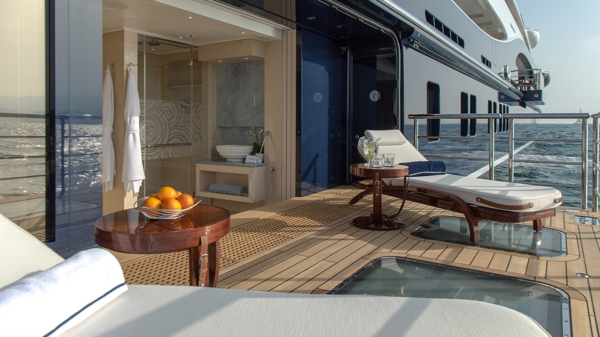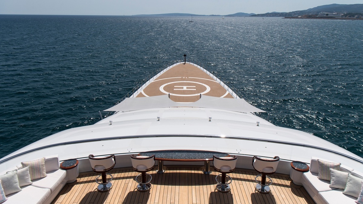 Luxury yacht Tis will allow you to enjoy a sauna, an ice fountain, a 12-meter long swimming pool, a relaxation room with a bar, a massage room, a barber shop, a tea room; also avialable are a garage and two helipods. And what's more, the area originally reserved for aircrafts can be used as a dance floor with an outdoor cinema.