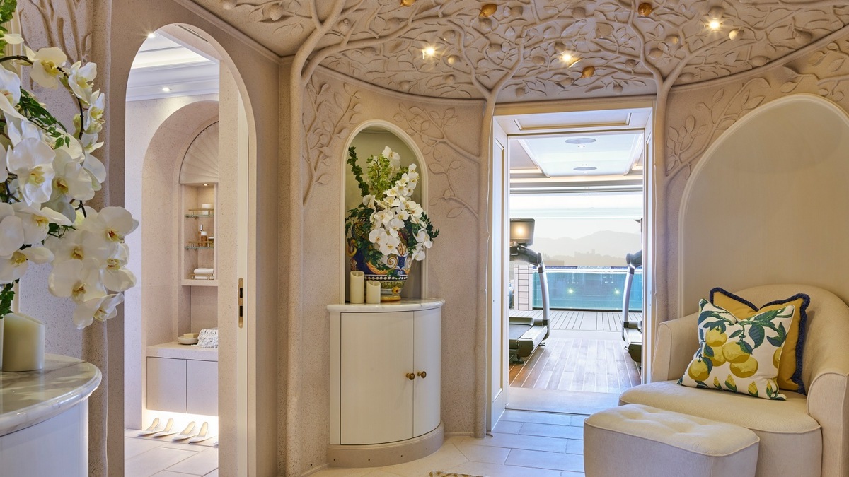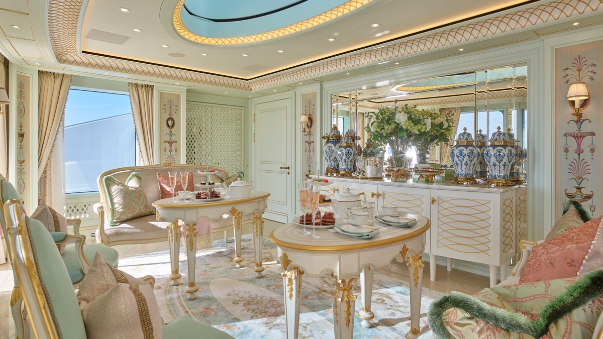 The interior part of the ship hides stunning areas designed in the spirit of various destinations from all over the world. In a blink of an eye, you'll find yourself in Marrakesh, China, Russia, French Provence, Tuscany, London, Paris or New York. The Provence-style suite boasts a yellow-pink wallpaper with a bee motif. The China suite will charm you with abundance of green tones, textured walls and bamboo decorations. Paris draws inspiration from the flower world, New York is characterized by Art Deco elements, Marrakesh boasts deep pink accents and furniture with mother-of-pearl details. The main landmark of the yacht is the entrance hall, stunning in appearance, which makes you feel as though you were in the Versailles Castle in France.