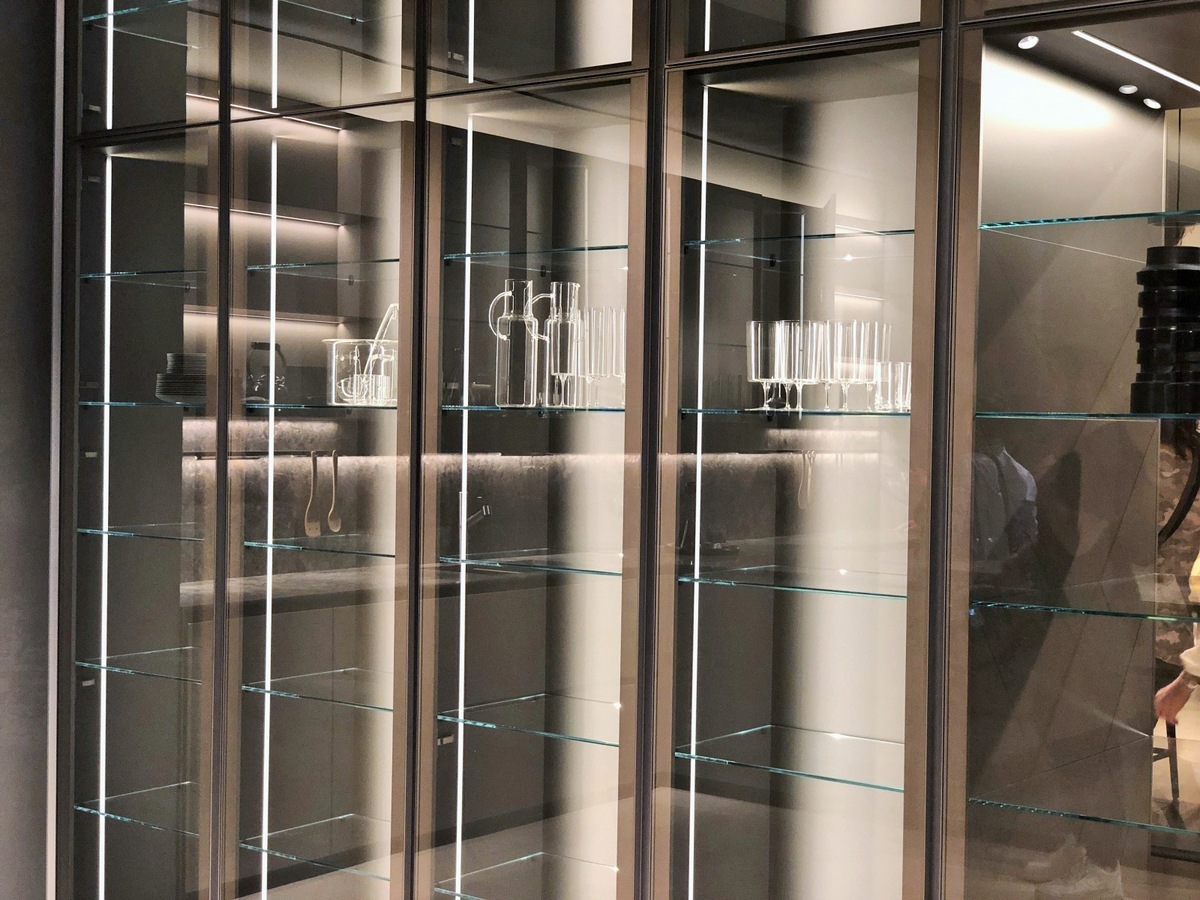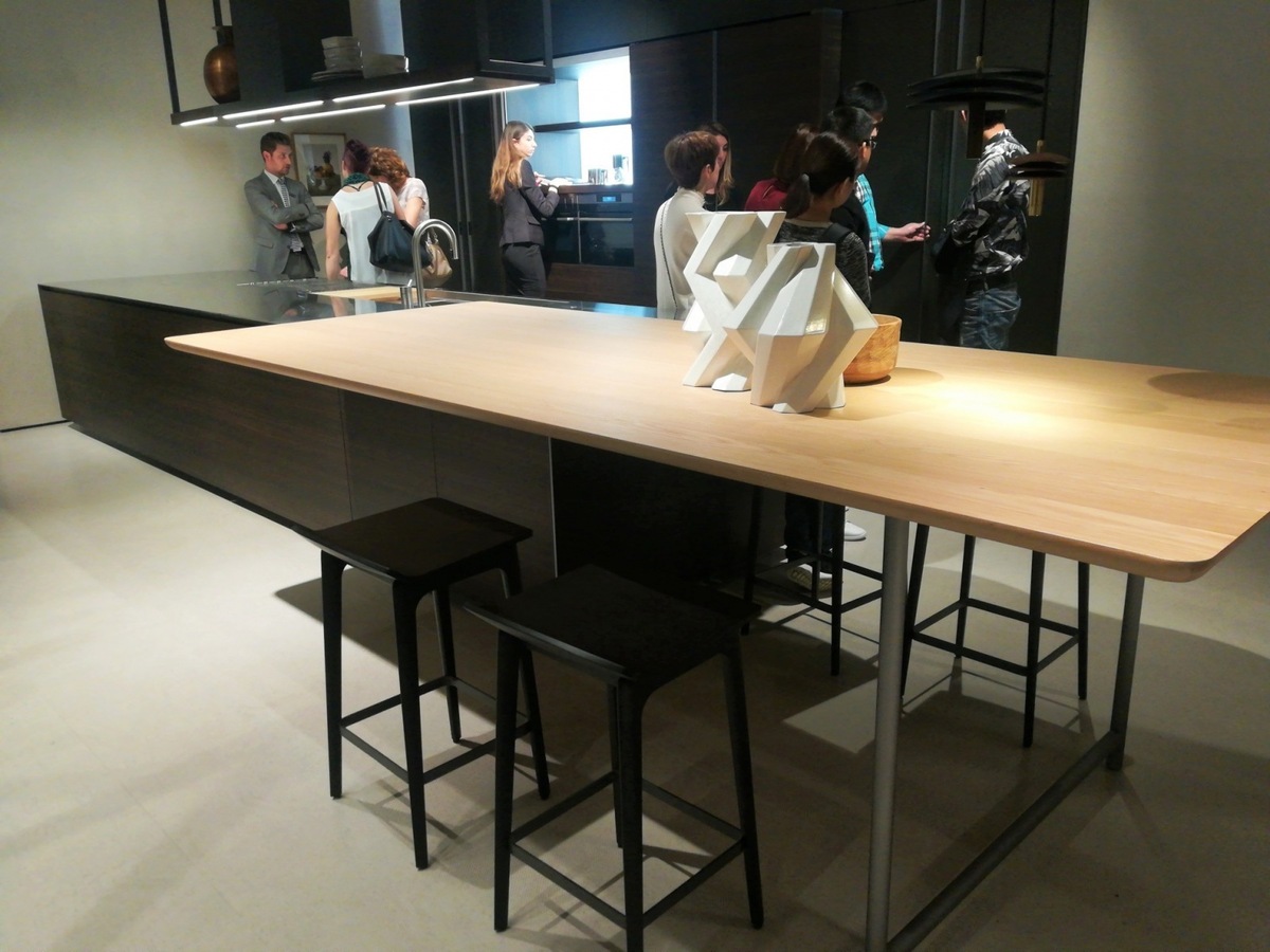 At its exposition, Dada presented a kitchen in the form of an island in the middle of the room. It was already presented two years ago, yet it still captivates with its practicality and luxury design. The back-lit system of glass shelves on the wall is very elegant. We also appreciated the new kitchen with a majestic marble slab on thin metal legs that will appear on the market this May. In addition to this, there was also a new kitchen named Prime with a stone countertop and a kitchen with a massive oak countertop. Novelties included the Fare shelf system (in our gallery).