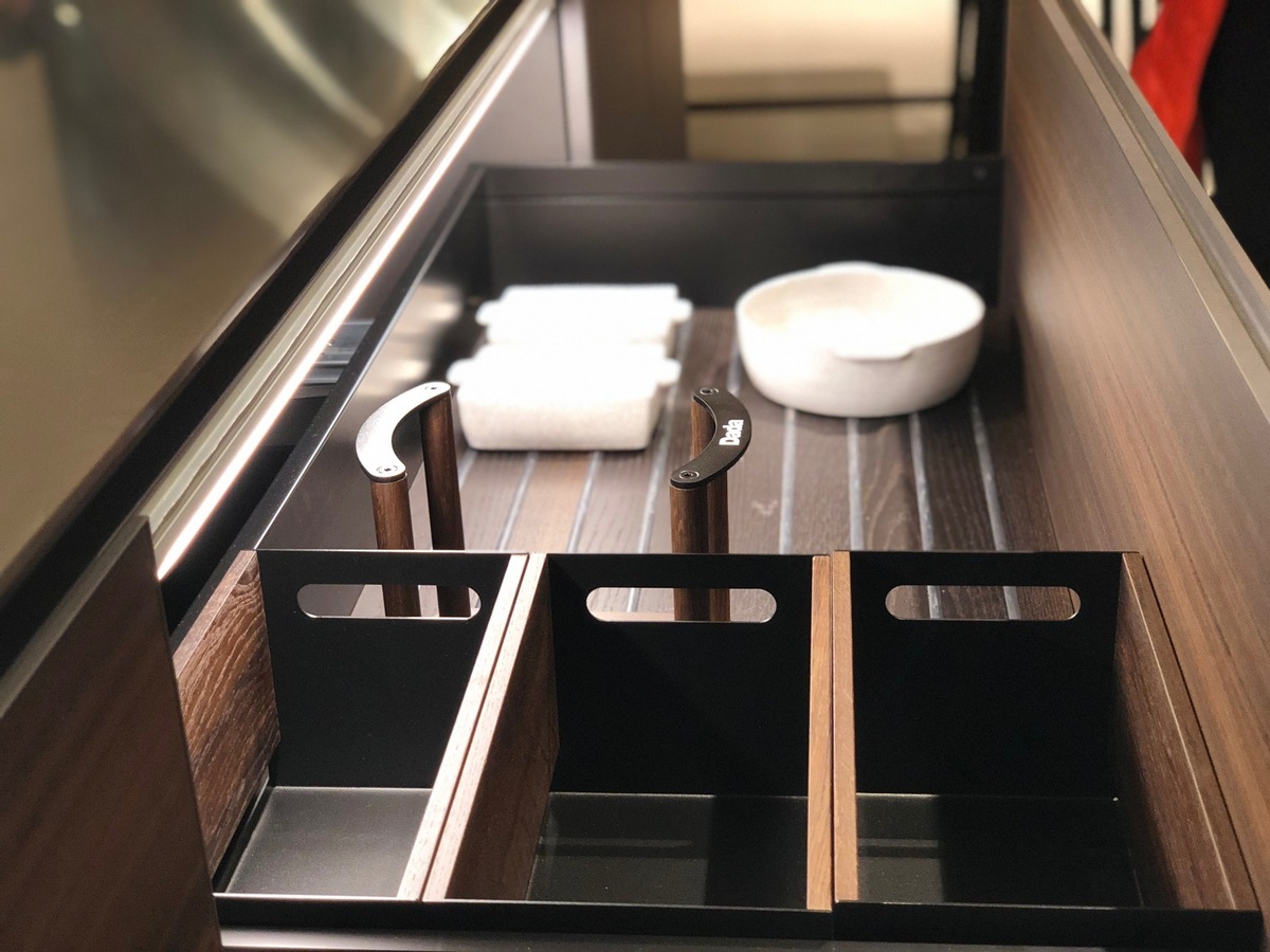 Do you want to change the appearance of your kitchen in a flash? Dada presented a unique cover system for the kitchen counter. Two panels located on the sides of the counter open up like an accordion and elegantly cover everything. Visitors can only guess which room they are in!