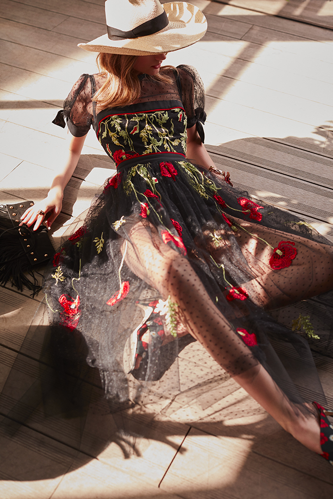 The woman in the eyes of Elie Saab is always perfect, even on holiday. Over the course of the day, she wears luxurious airy bohemian dresses and blouses of lace, tulle, chiffon and silk, and in the evening she transforms into a sensual, sexy vamp with long slits, sinful mini-lengths and high gloss. There are dazzling sequins and gold and silver accents.