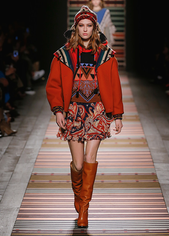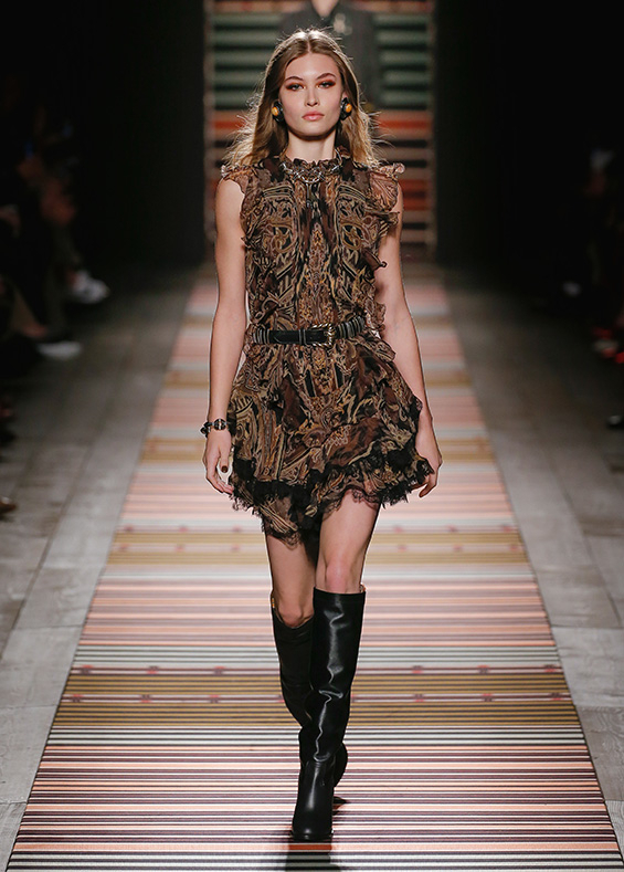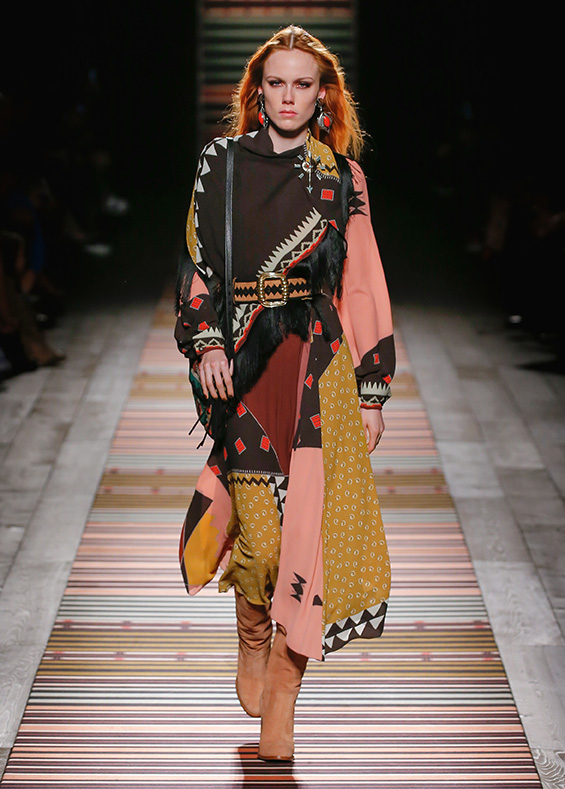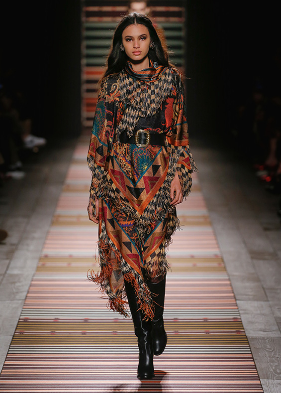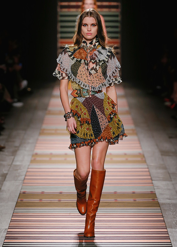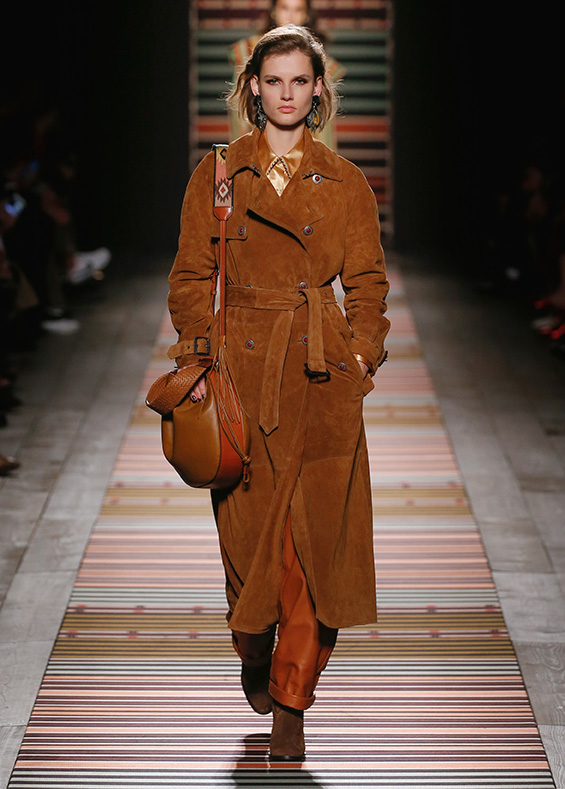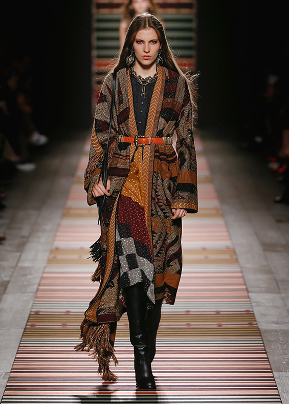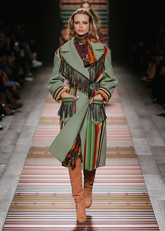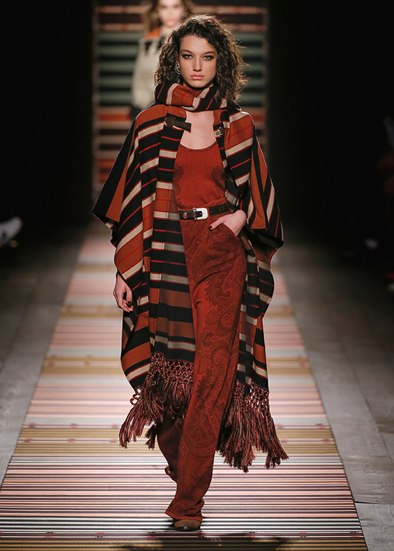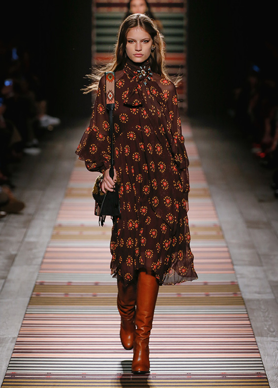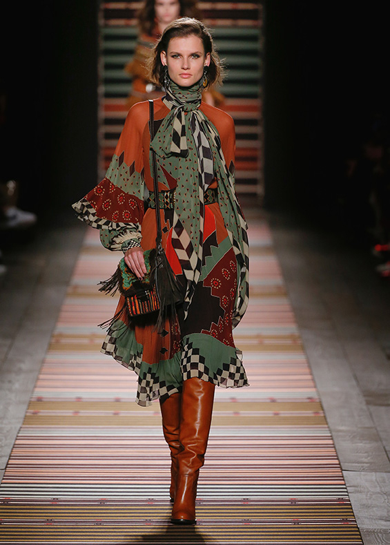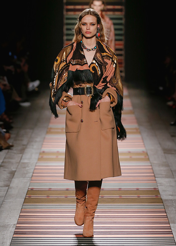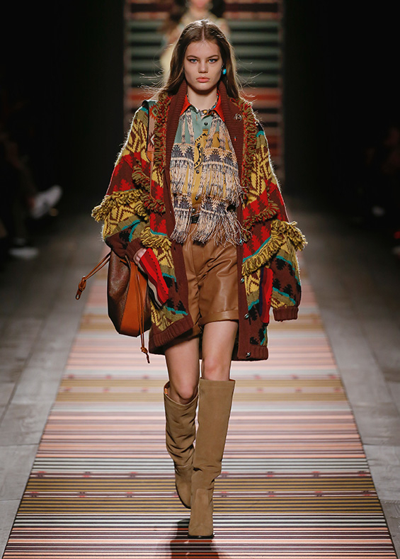 Contrasting strips accentuating feminine curves, woollen caps, silk scarves and shoulder bags have proved to be stylish accessories that perfectly resonate with the luxurious boho style of Etro. Among the most successful pieces of the collection are suede high boots in earthy tones. Although they are not very practical for a rainy autumnal afternoon, they are very easy on the eye and team up with boho style admirably!