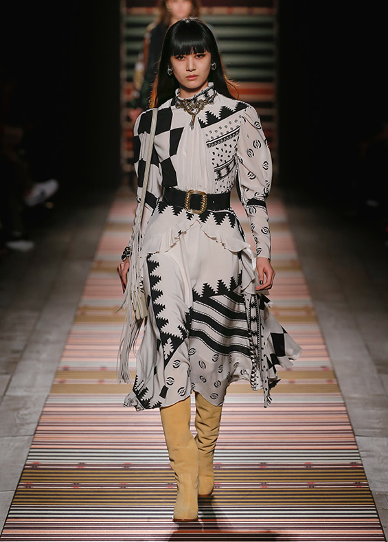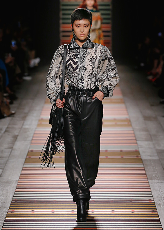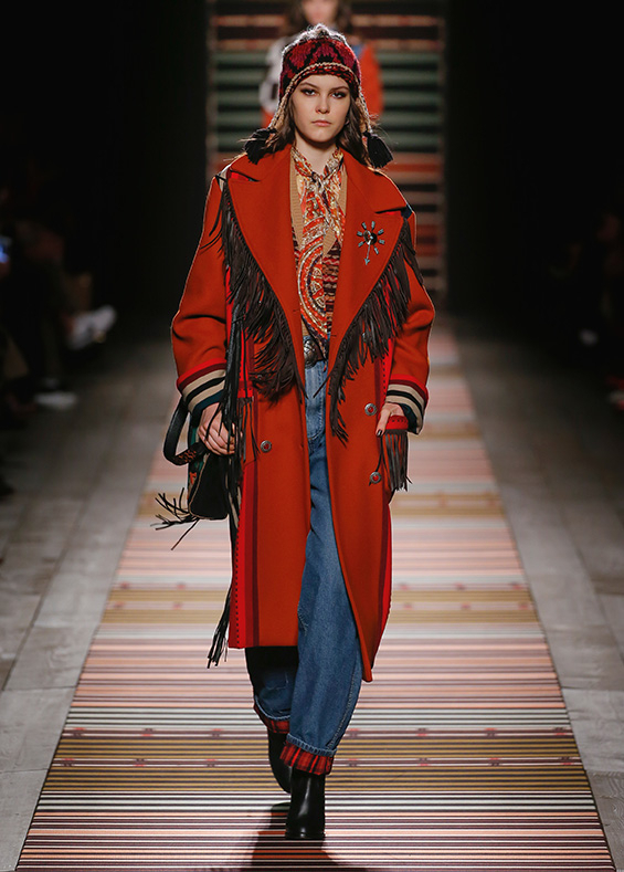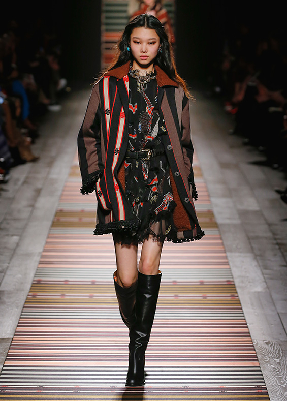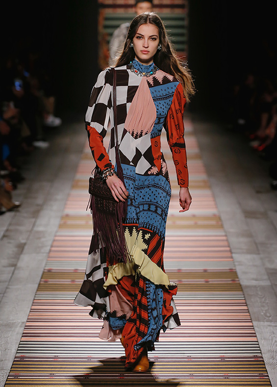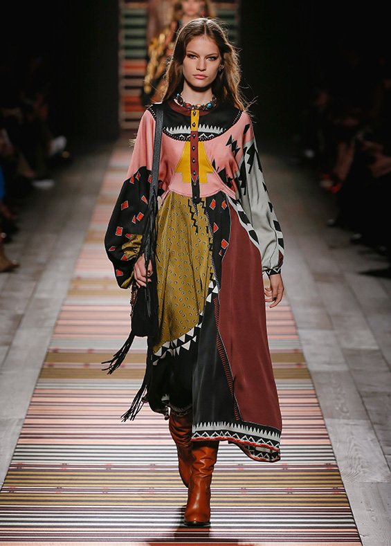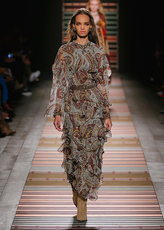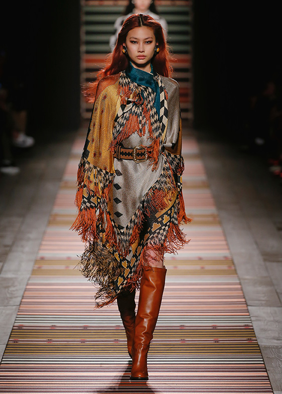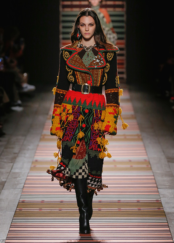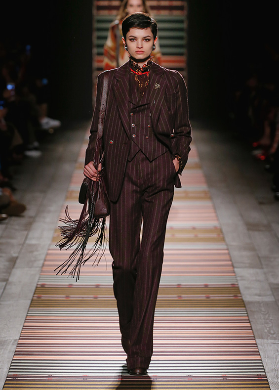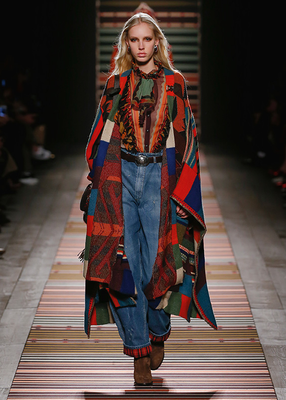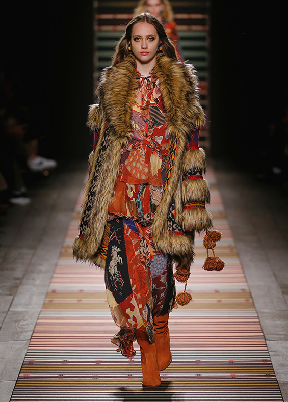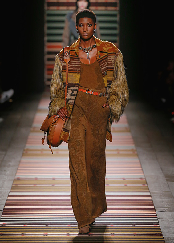Contrasting strips accentuating feminine curves, woollen caps, silk scarves and shoulder bags have proved to be stylish accessories that perfectly resonate with the luxurious boho style of Etro. Among the most successful pieces of the collection are suede high boots in earthy tones. Although they are not very practical for a rainy autumnal afternoon, they are very easy on the eye and team up with boho style admirably!