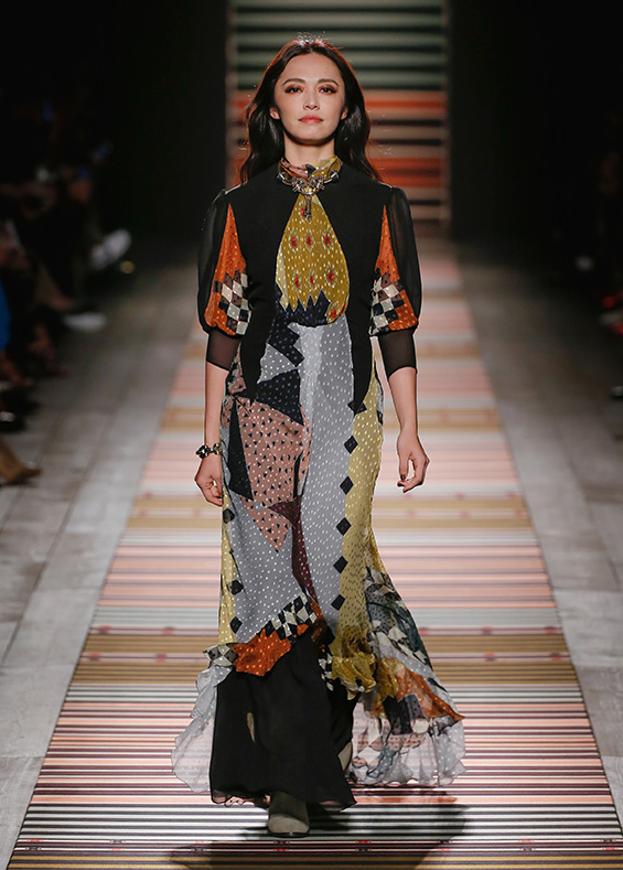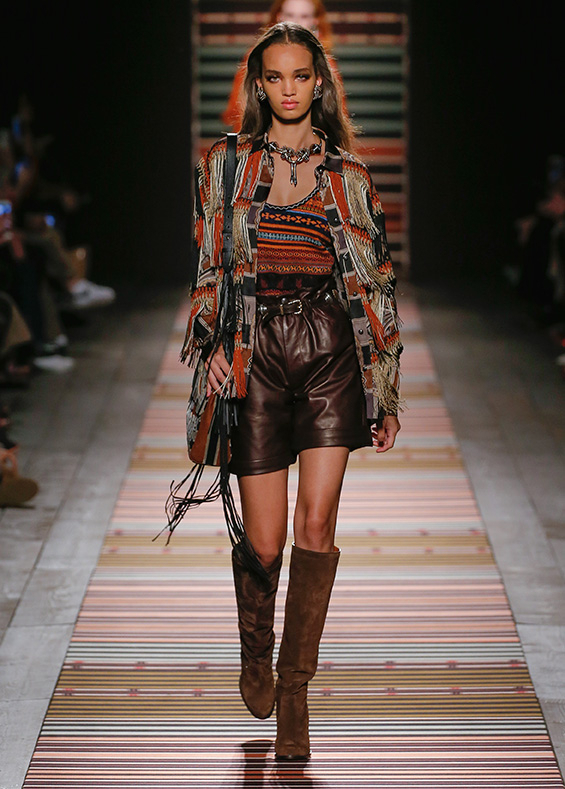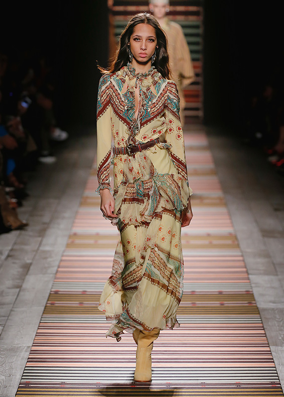 There are plenty of earthy tones inspired by the countryside - brickstone, sand, earthy brown, mustard, khaki, bordeaux, ochre or white. In the question of materials, Veronica Etro did not limit herself too much, having reached for wool, silk, suede, leather, jacquard, chiffon or, for example, denim. The thematic boho style was perfectly accentuated by tassels, trimming the garments themselves as well as the luxurious accessories.