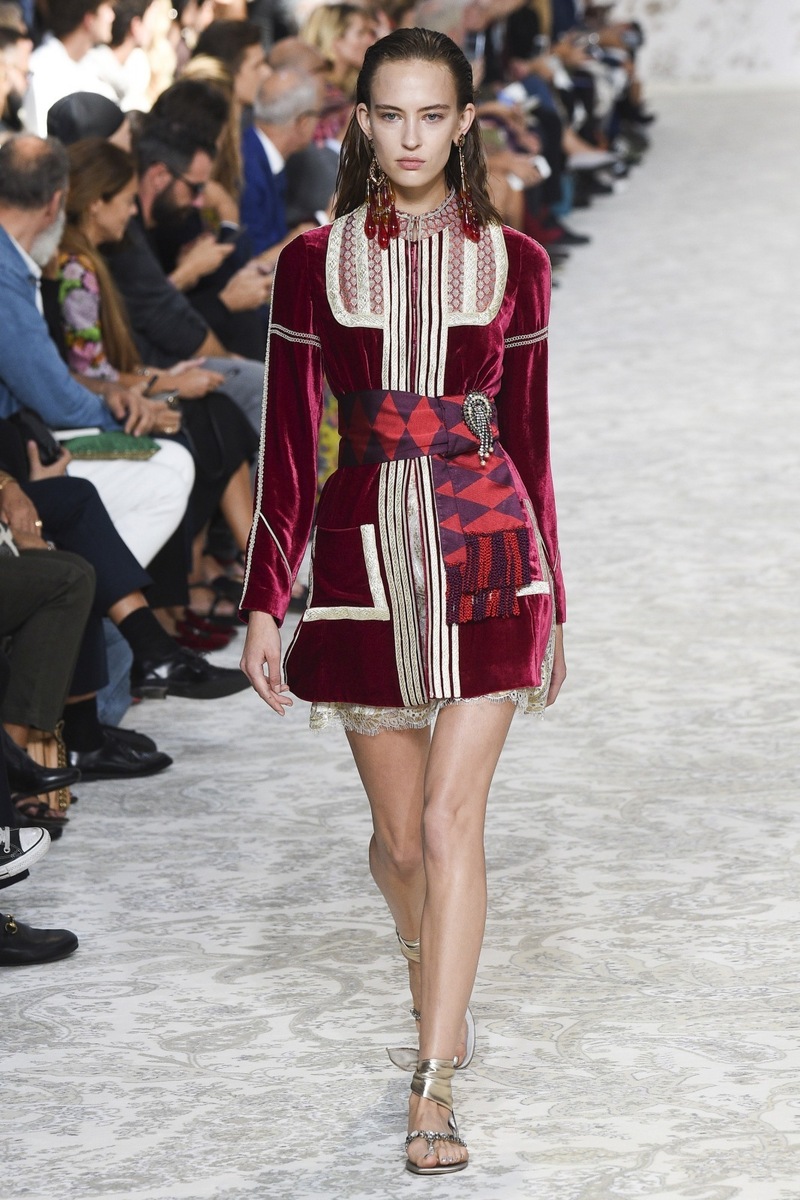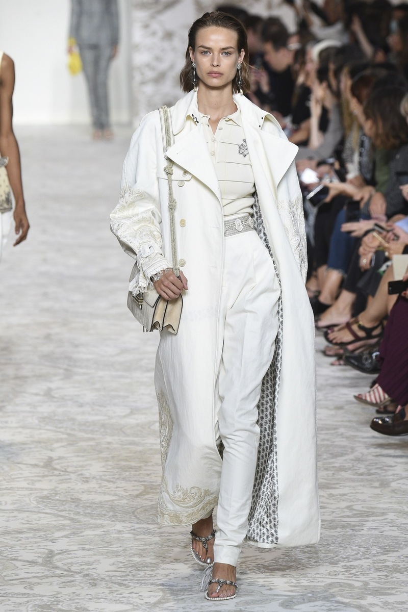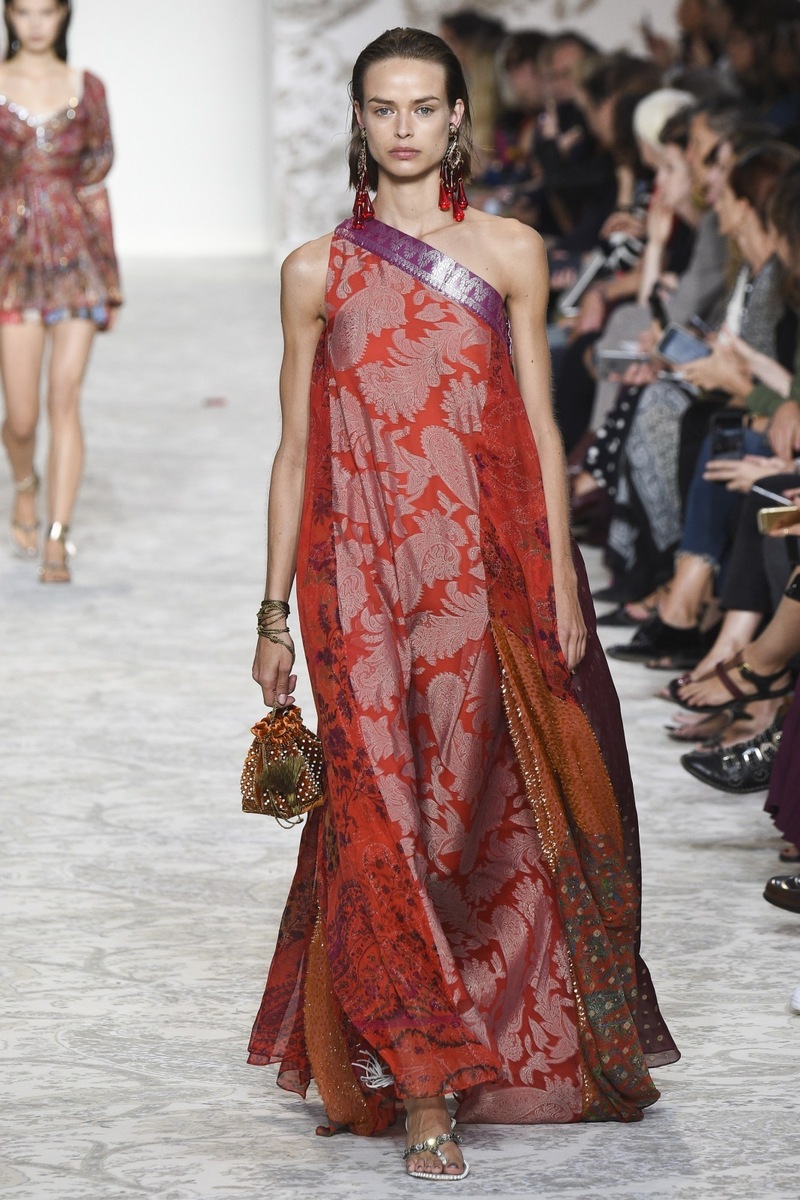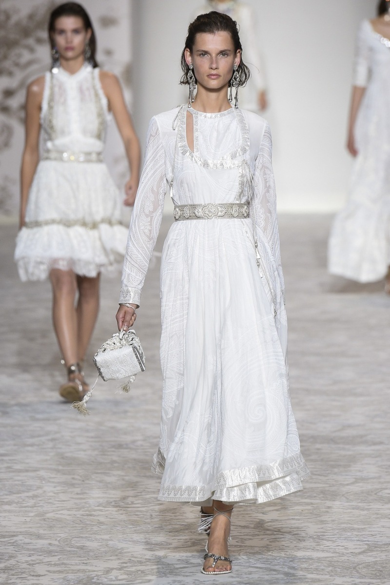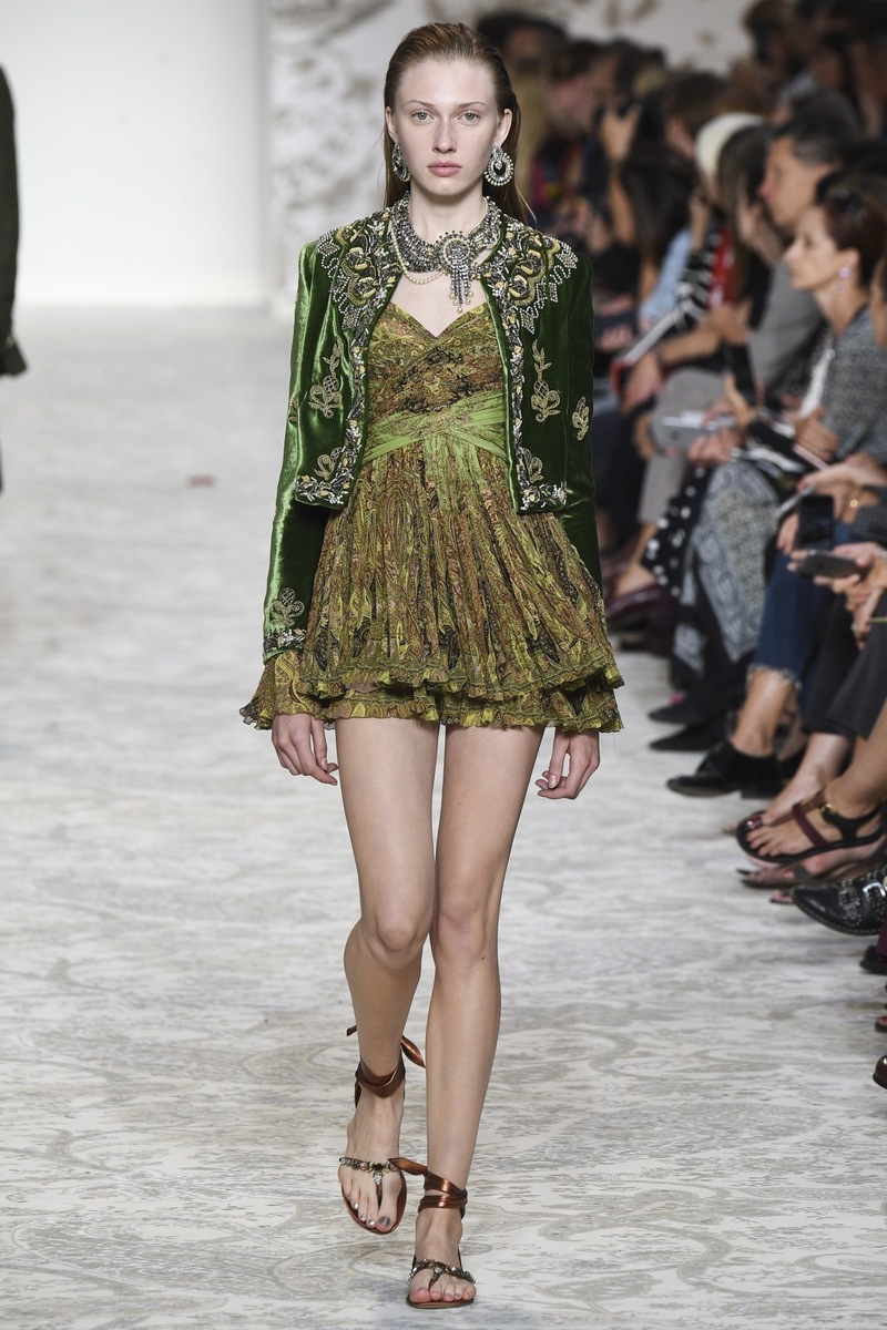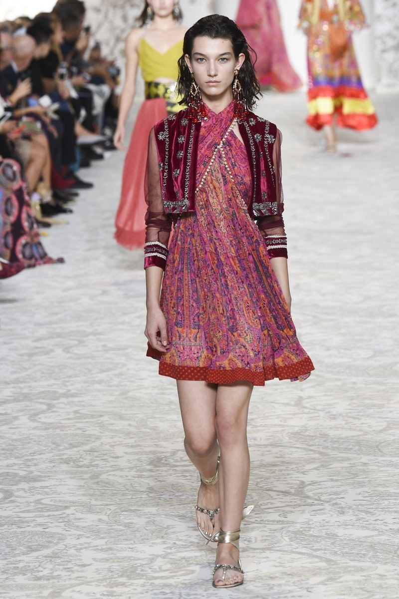Etro SS 2018 creates mostly mini and maxi dresses in the Boho-chic style, elegant pantsuits, coats and suit jackets, or embroidered bodices and tops from Jacquard fabrics. Used materials include airy chiffon, shiny Jacquard, luxurious velvet as well as more traditional silk and cotton. Many models are decorated by a fine lace.
