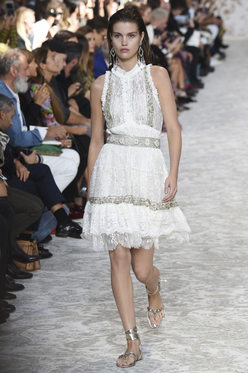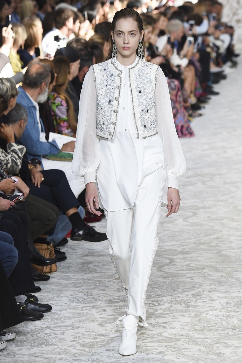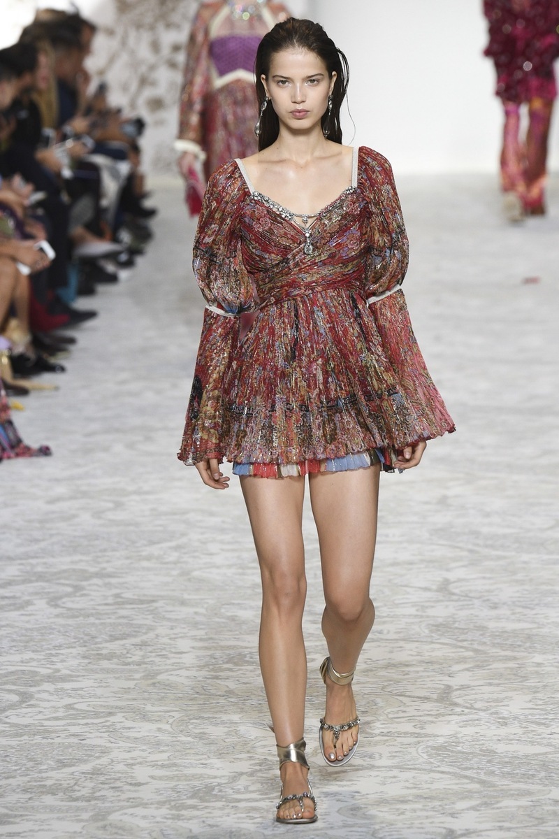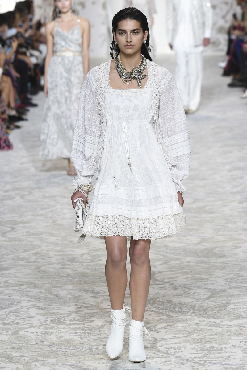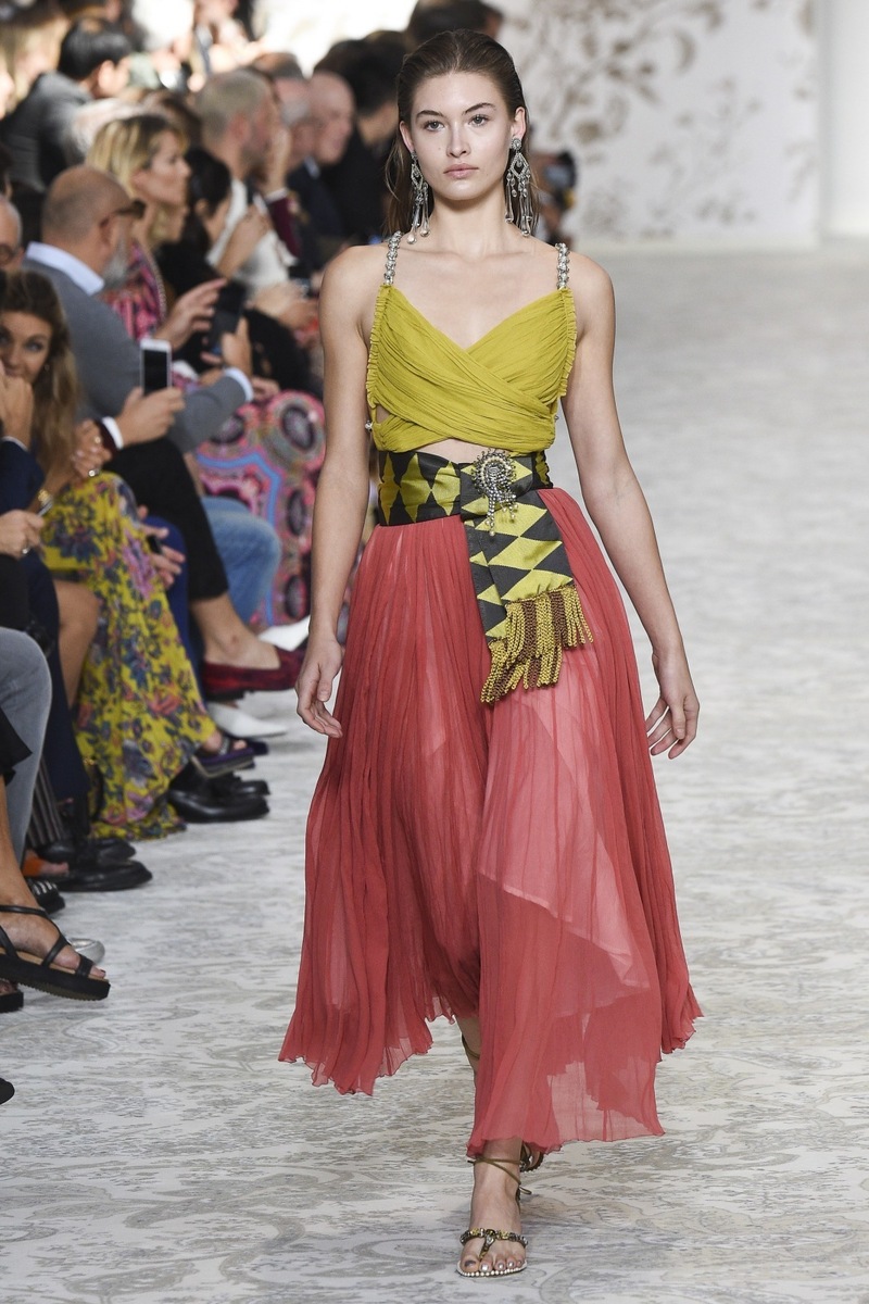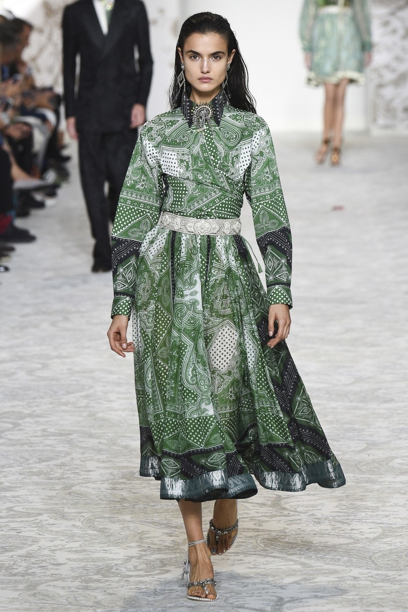 Etro SS 2018 creates mostly mini and maxi dresses in the Boho-chic style, elegant pantsuits, coats and suit jackets, or embroidered bodices and tops from Jacquard fabrics. Used materials include airy chiffon, shiny Jacquard, luxurious velvet as well as more traditional silk and cotton. Many models are decorated by a fine lace.