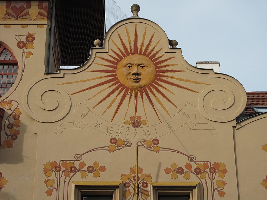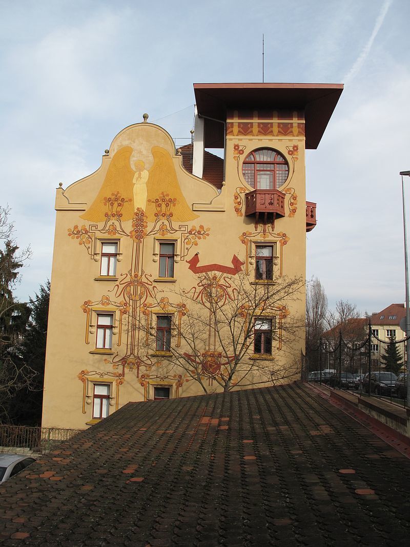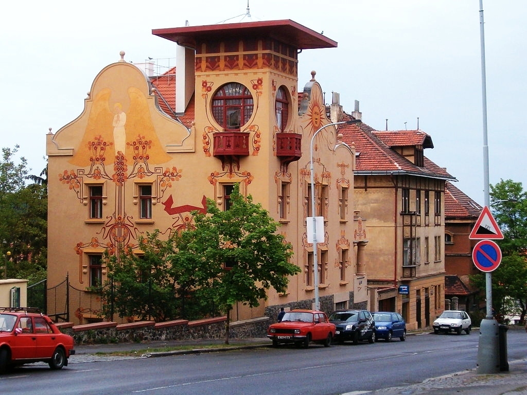 It is painted a bright ochre colour. The entire façade is tastefully decorated by frescoes with Art Noveau symbols by the pen of artist František Kobliha and the square tower at the corner with segmented windows draws the eye at first glance.