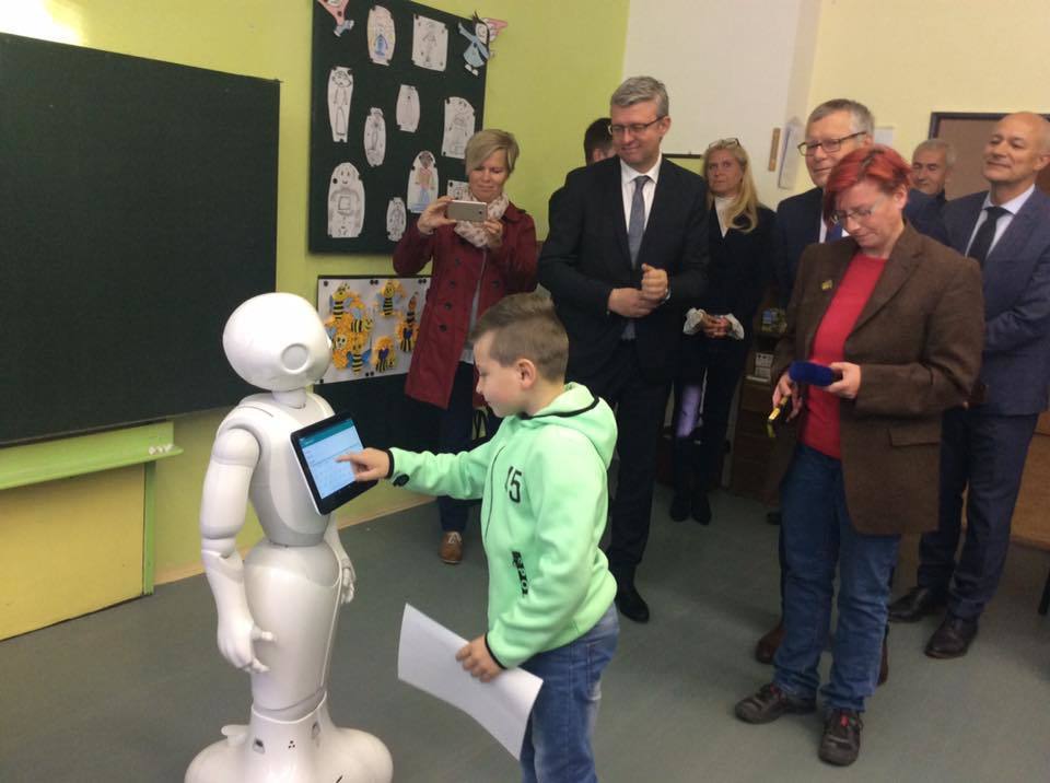 The project of teaching in tandem with a robot has been brought about mainly by the Innovation Center of the Ústí Region. It financed the 20,000 CZK purchase of the robot. The project will run for three years. After that it will be decided whether the use of robots in teaching is beneficial. BENEFICIAL! Do you hear that? Like, who is going to be evaluating that, and how?