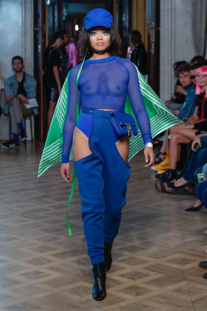 Then we have the beautiful Asian model in a bright blue suit made of transparent mesh, high-waisted panties and interesting cut out sweatpants with a belt holding a mini handbag. Then the essentially absolutely original show of a young trio got at this point a bit stuck on a slight case of plagiarism (I repeat, slight). Do you remember cooperation of Rihanna and Manolo Blahnik and their common work "Denim Thigh-high Belted Boots" that is denim musketeers with a price tag of CZK 88,000? Let´s just say that the similarity with this model is quite close. The next time, I recommend to be inspired by less memorable pieces, please..