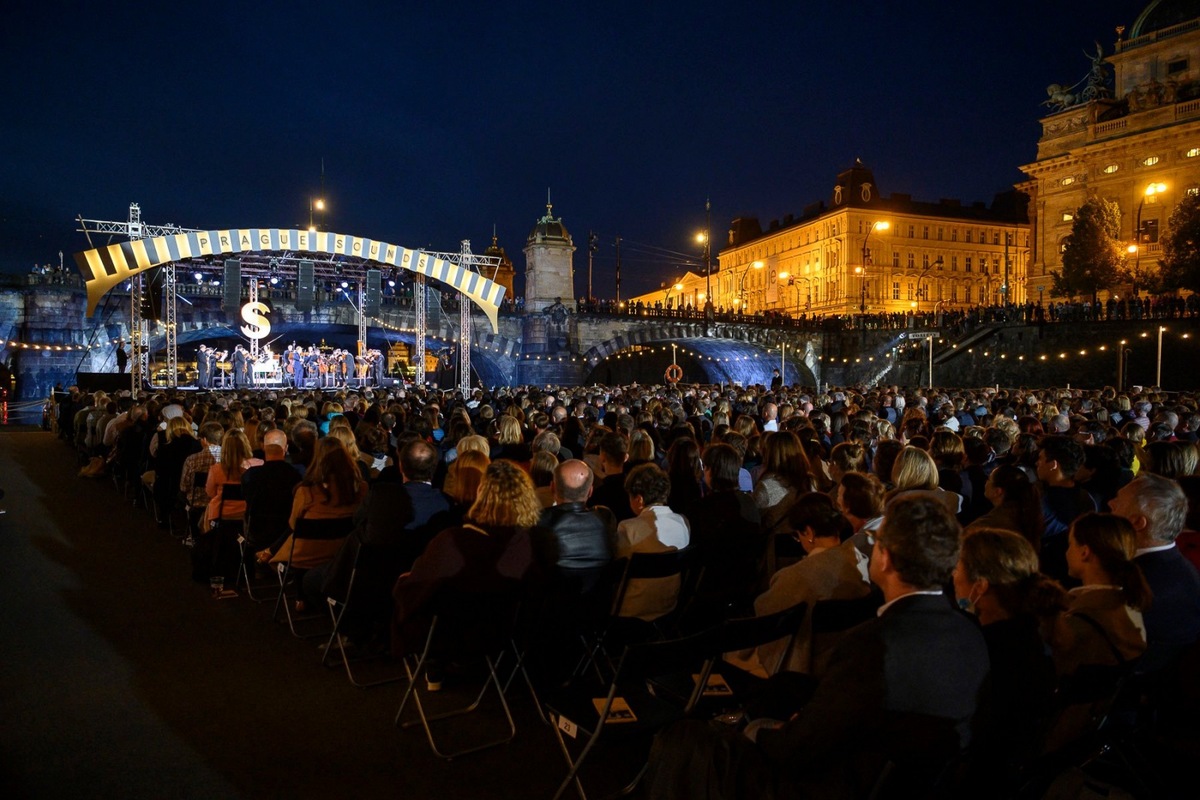 The floating stage was located right on the river between Střelecký Island and the National Theater. Seagulls were flying overhead, trams criss-crossed the Legion Bridge. Some visitors were watching the concert from pedal boats rather than chairs. Drawn by the music, random passers-by gathered on the bridge and on the street by the National Theater. The atmosphere was completed by a breathtaking panorama of Prague Castle on the backdrop.