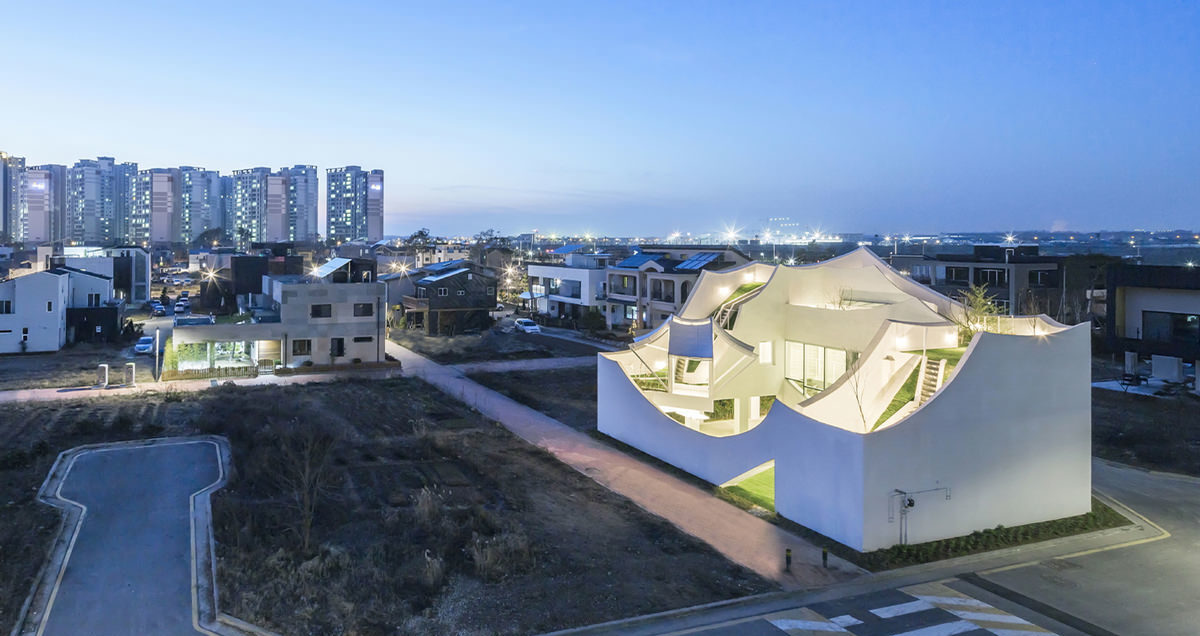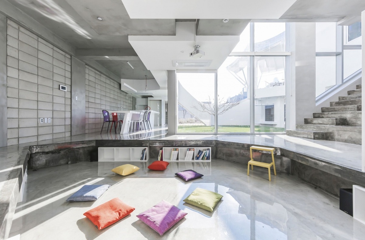 The house was built in the South Korean city of Incheon (near Incheon Airport). It was commission by a pilot and it is designed for use by his family. The project and construction of the house were designed by the architects IROJE KHM. When first exploring this modern house, it is not clear where the house starts and where it ends. The house reflects sunlight in shades of white and literally blinds you. The space spreading out over an area of 195 m2 is brightened up by semi-transparent roofs. Apart from this, every room opens out onto the garden and creates an airy feeling.