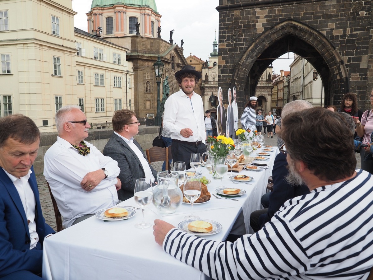 "We‘ll build a 515-meter-long table with white tablecloths and flowers in vases on the 515-meter-long Charles Bridge. And we‘ll invite guests to join us at this table. Anyone can come, there‘s no entrance fee. But we do have one condition: everyone has to bring something. One person will, for example, bake a cake, a pie or a goose. Another guest - and simultaneously host – will prepare appetisers. Someone else will bring a rose to put in a vase. Or maybe just grape wine. Or they‘ll bring a guitar and we‘ll sing „Bridge over Troubled Waters“ together…,"