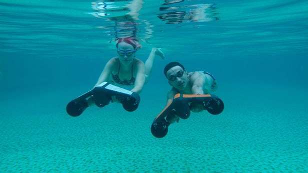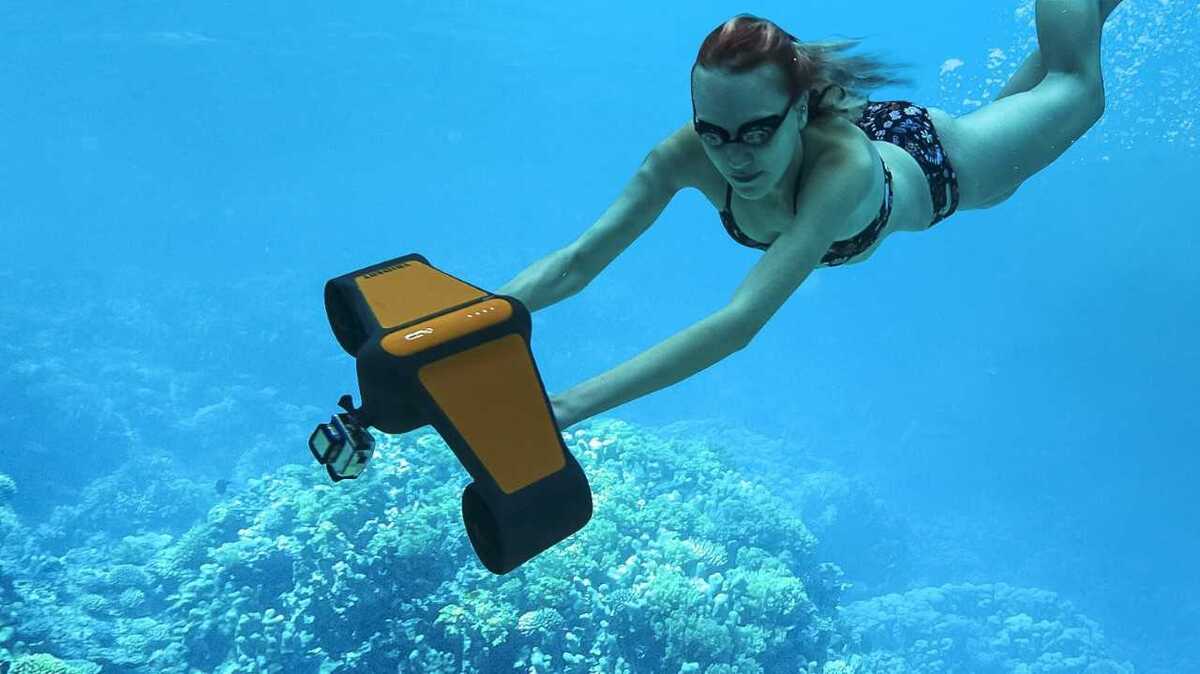 The exquisite scooter Trident was designed in such a way to allow you to dive to a maximum depth of 50 m. It is only up to you, what kind of tricks you make it do. It is supported by two in-built propellers producing a thrust of 12kg. The scooters give the users a choice of 2 speeds, 3.6 and 7 km/h (2.2 and 4.3 mph) thanks to a trigger controller.
