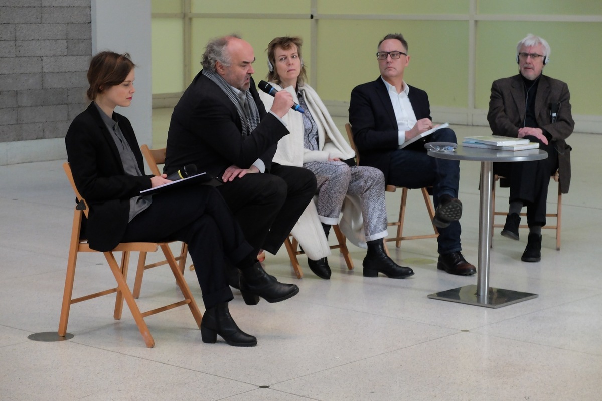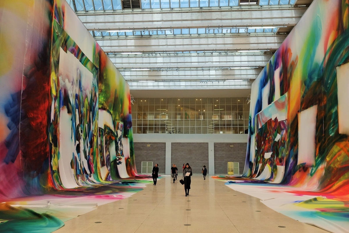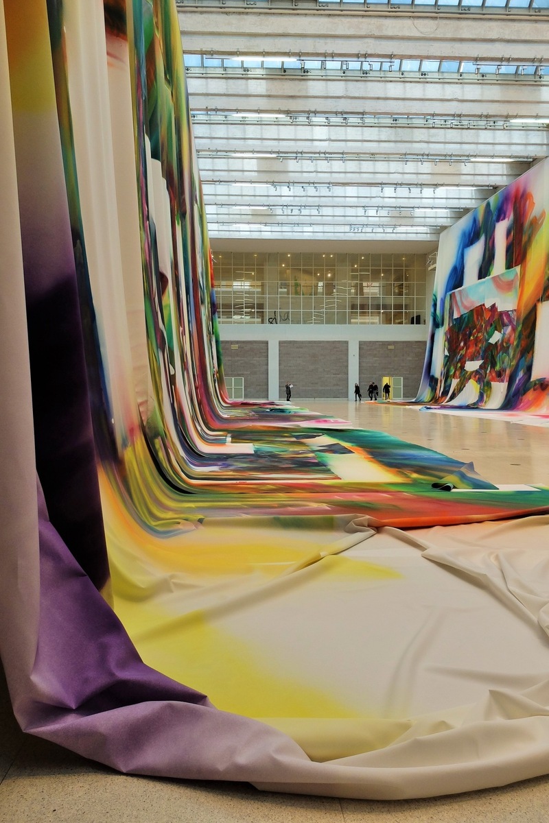Katharina Grosse was present to the press conference, where she praised the luxurious space of the Great Hall of the Trade Fair Palace where her work took the place of the Chinese artist, Ai Wei-wei. Instead of a huge boat full of refugees you can now admire enormous canvases painted to fit this space, called the Miraculous Painting.