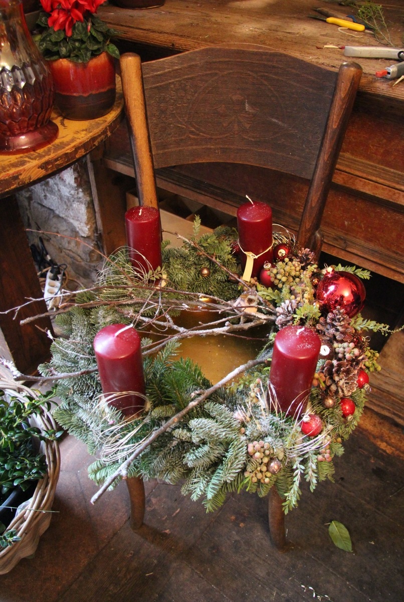 A permanent feature here is the advent wreath which comes in many forms. Use is made of classic fir branches, but also pine, holly, moss, pine cones, bark, fabric and various other types of twigs.