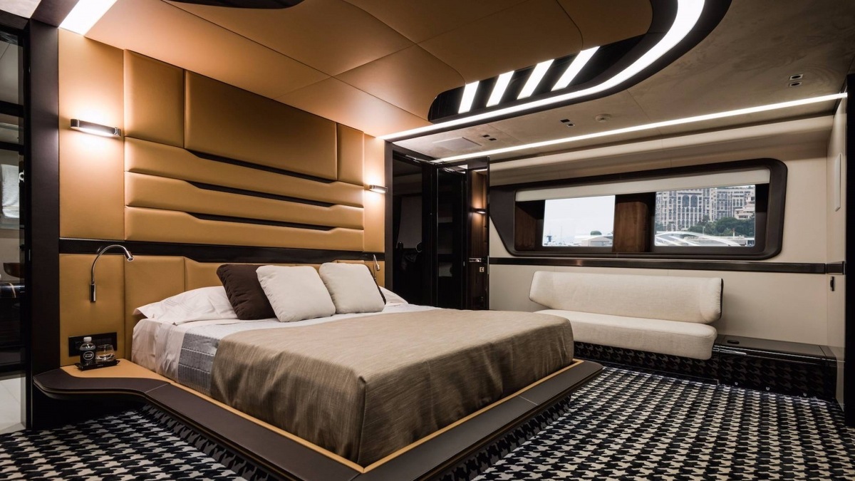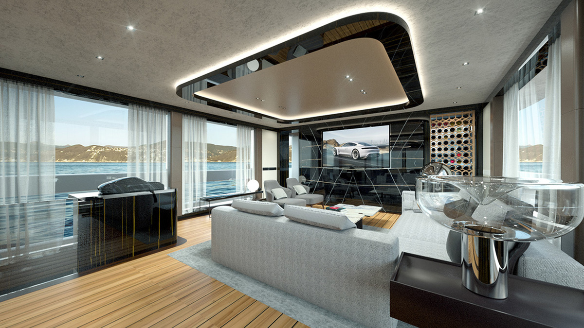 The F.A. Porsche Studio is responsible for the deluxe exteriors. The GTT 115 contains elements by the Porsche automobile company in compliance with the futuristic concept of the Mision E vehicle. The yacht’s exterior is available in the following colours: “Carrara White”, “Rhodium Silver”, “Chalk” or the special “Monte Carlo Blue”. The interior has three or four cabins with Italian furniture designed by the Minotti Company. Brown and beige are the most distinctive colour tones.