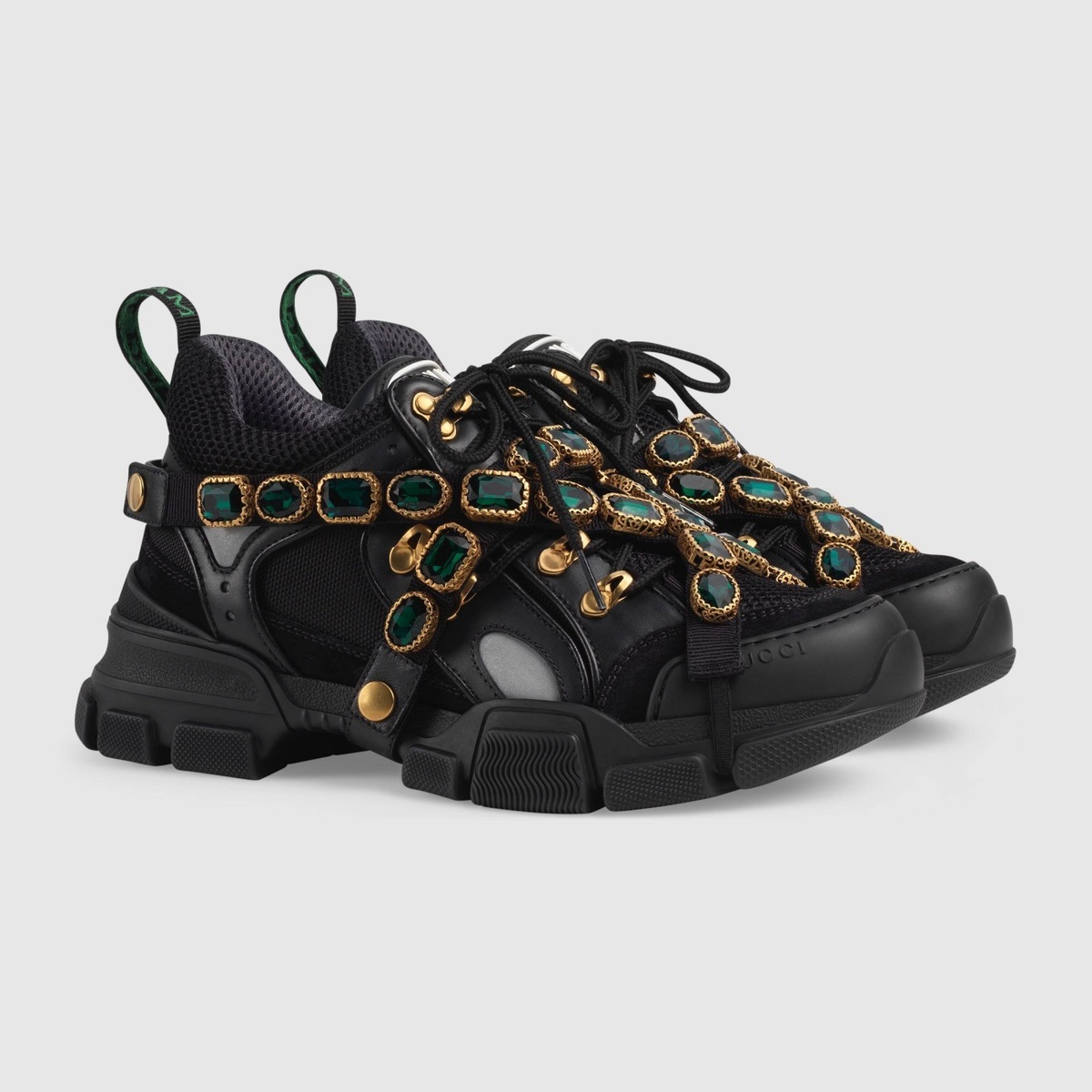 After the recent collection Dapper Dan, the popular Italian brand came up with a plethora of new models of sneakers. They are blending sports style in combination with luxurious elegance and some are finished off by a jewel. Several models inspired by tourism, bearing the name of Flashtrek were embellished by Gucci by a flood of sparkling crystals.