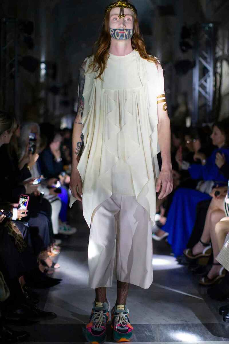 No fashionable narrow pipes, but white tunics complemented with sneakers, gold earrings and headbands, and colourful suits one size too large. Gucci's collection, referring to Rome, is both a disappointment and a big challenge. Indeed, if laughter really extends life and men start wearing asexual tunics, humanity will be almost immortal!