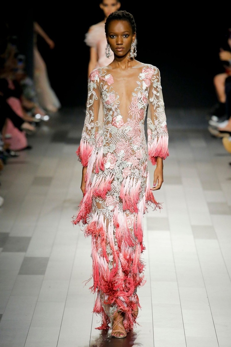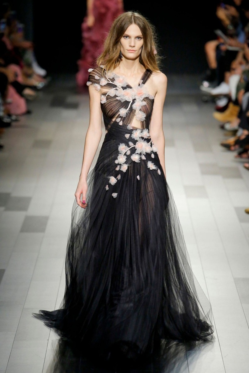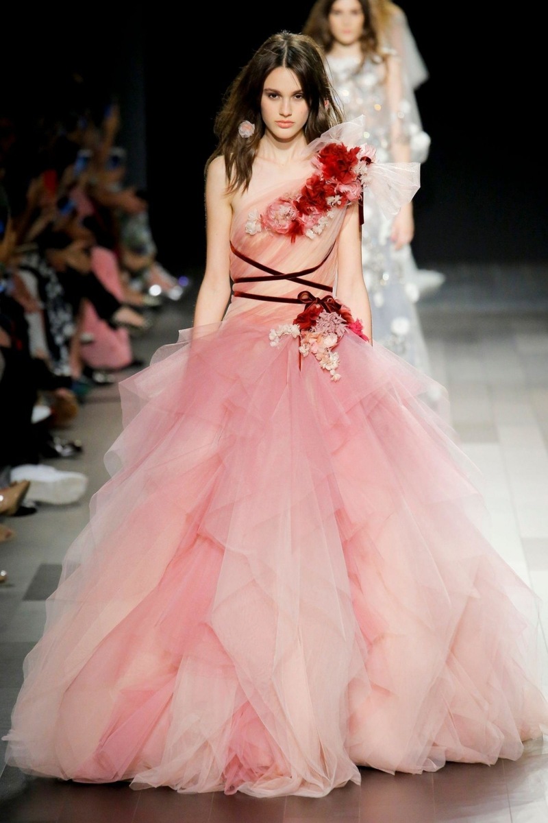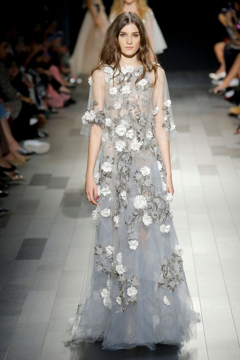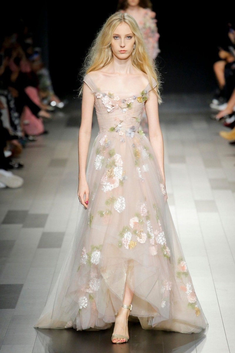 Georgina Chapman stated that the preparation of some gowns required hundreds of hours of uninterrupted handwork. When looking at the luxurious, detailed craftsmanship of these fashion masterpieces, it is clear that she wasn’t exaggerating. The gowns are embellished with crystals, pearls, feathers or romantic blossoms. The brand used fabrics such as organza, tulle and satin.
