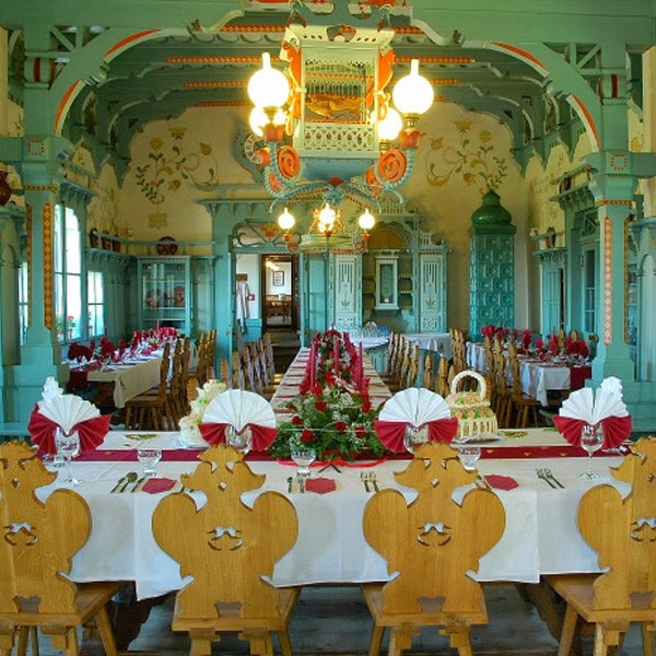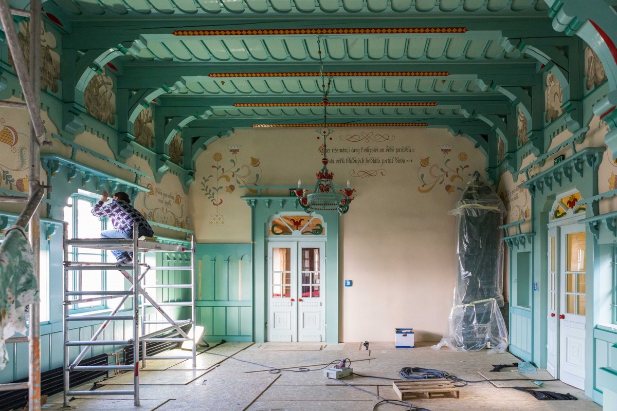The interior of the Art Nouveau folk building has also returned to its original form. For example, the craftsmen used a traditional method to create frescoes and sgraffito with motifs of Wallachian and Slovak legends by Mikoláš Aleš. Paints made according to the original recipe from linseed oil and natural pigments were applied to the plaster by hand. The dining room and the accommodation area have been preserved in the log cabin.