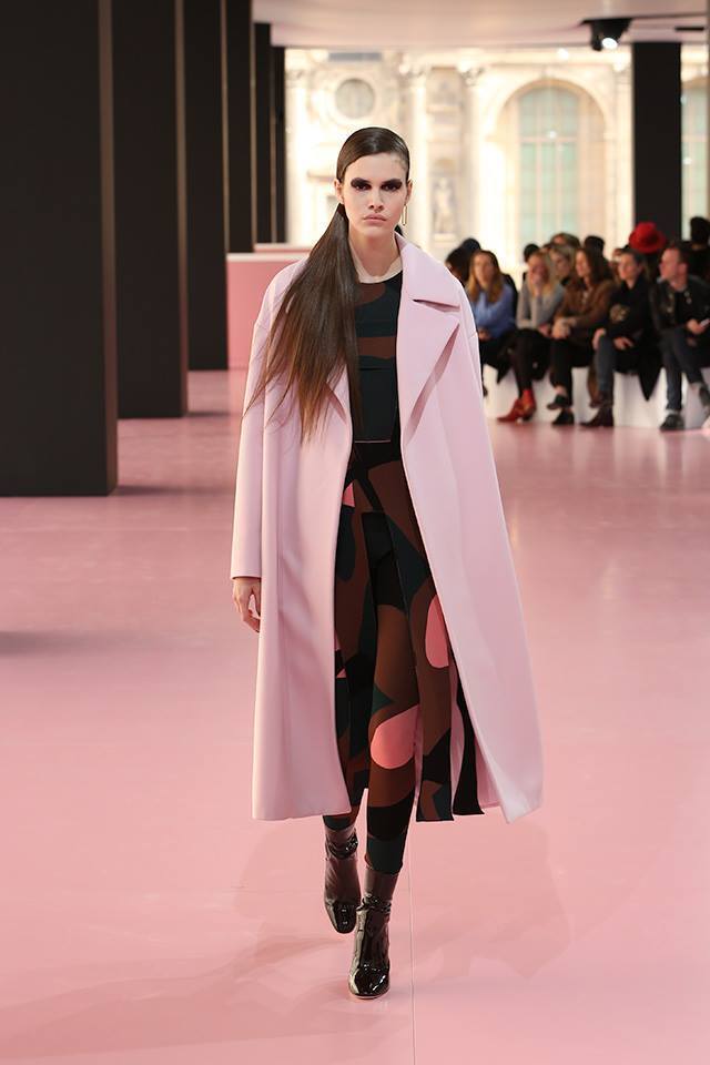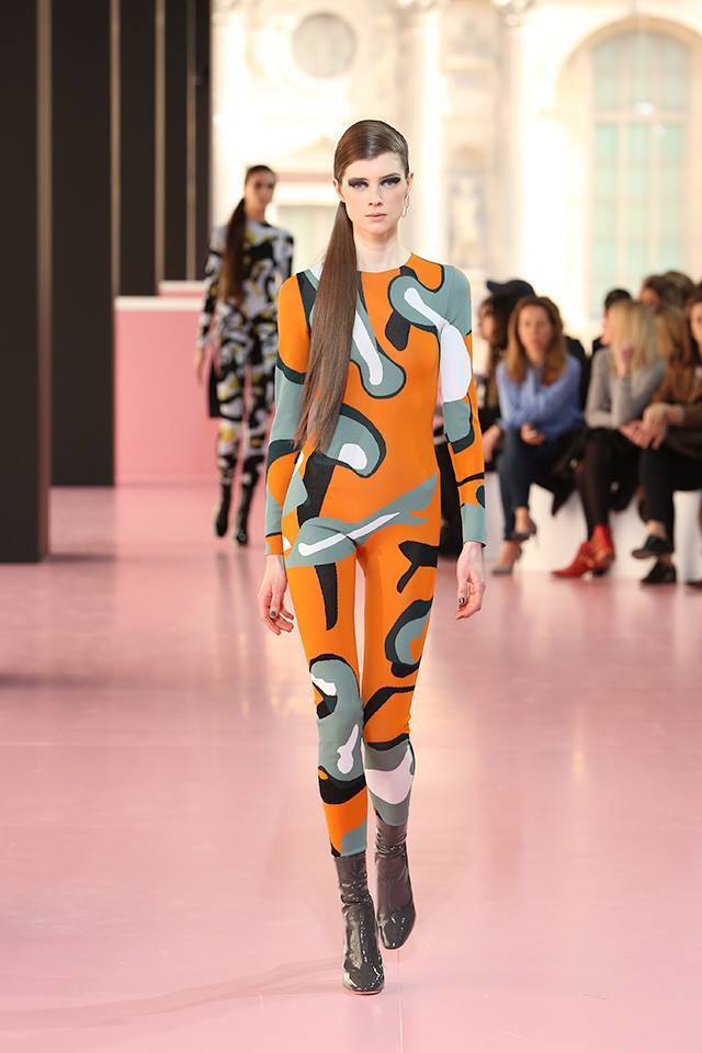A year later the collection already reflected Raf Simons´ wild side. It was dominated by bold patterns, applied by the creative designer to dresses, leggings, tops as well as overalls. While pieces such as a powder-pink coat or a burgundy-coloured dress is a luxurious fashion feat, the overalls as if cut out from a sci-fi movie leave you with a somewhat puzzled impression.