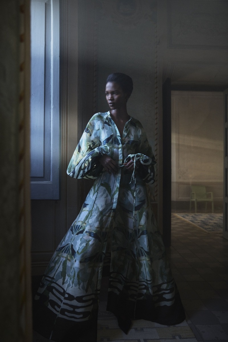 You will find several distinctive and unusual fashion items in this deluxe and fresh collection, such as the light long sleeveless dress with subtle embroidery, the long green dress embellished with deluxe floral metallic jacquard fabric or the irresistible trouser suit with flared trousers and a jacket with a sexy split. The clothing is embellished with floral jacquard, embroidery and abstract prints. Even the colour palette is very interesting. Choose from bold green, classic black and white or pastel blue and subtle powder pink. We are also interested in the subtle jewellery with the tulip motif, made from recycled silver.