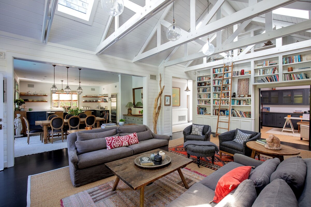 The house looks very airy, mainly due to the interconnection of several rooms and the high vaulted ceilings, which resemble those you would find in a barn. Moreover, their white colour adds to the freshness of the interior and visually enlarges the room.