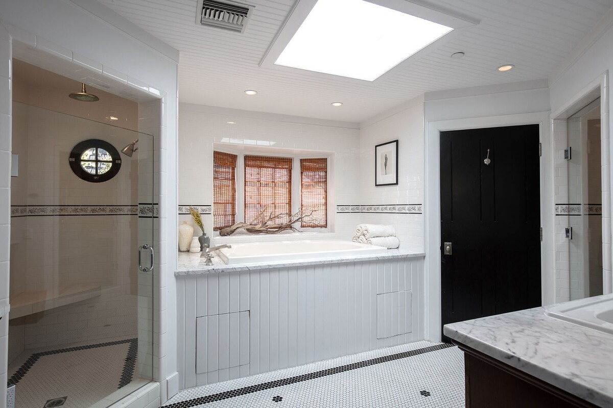 The master bedroom with a high ceiling can be considered the refuge of the house. You'll find there a study, a marble bathroom, a huge walk-in closet and a sunny terrace overlooking the courtyard. The most unique element of the private bathroom is its high bathtub. Many people might need a stool to climb into it!