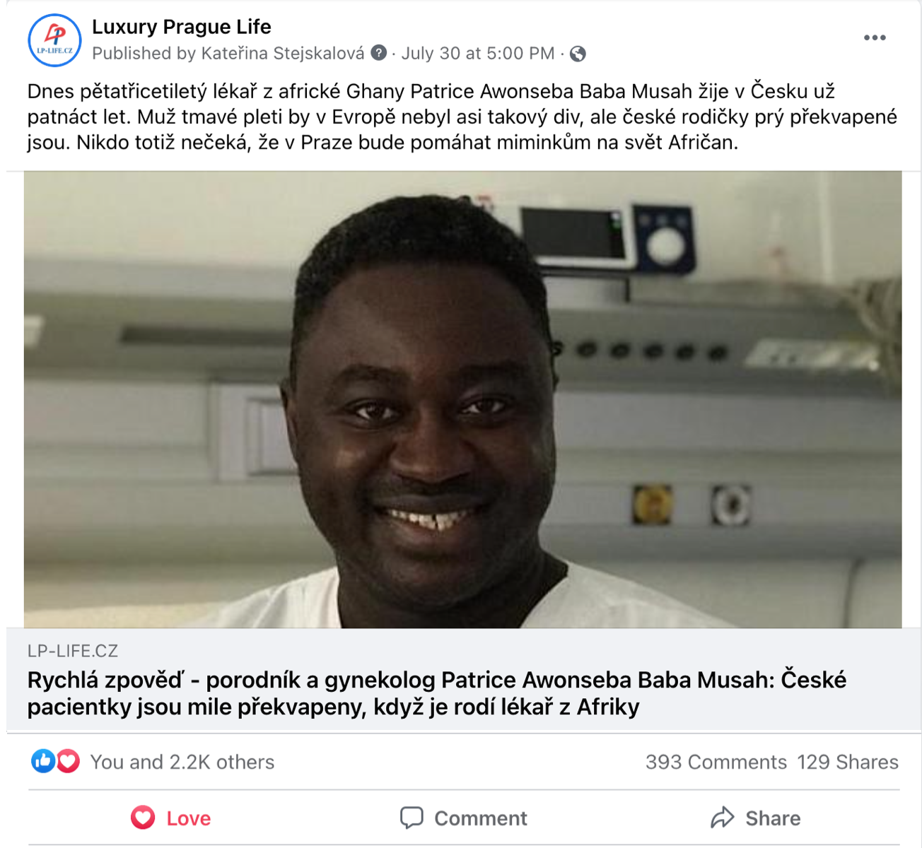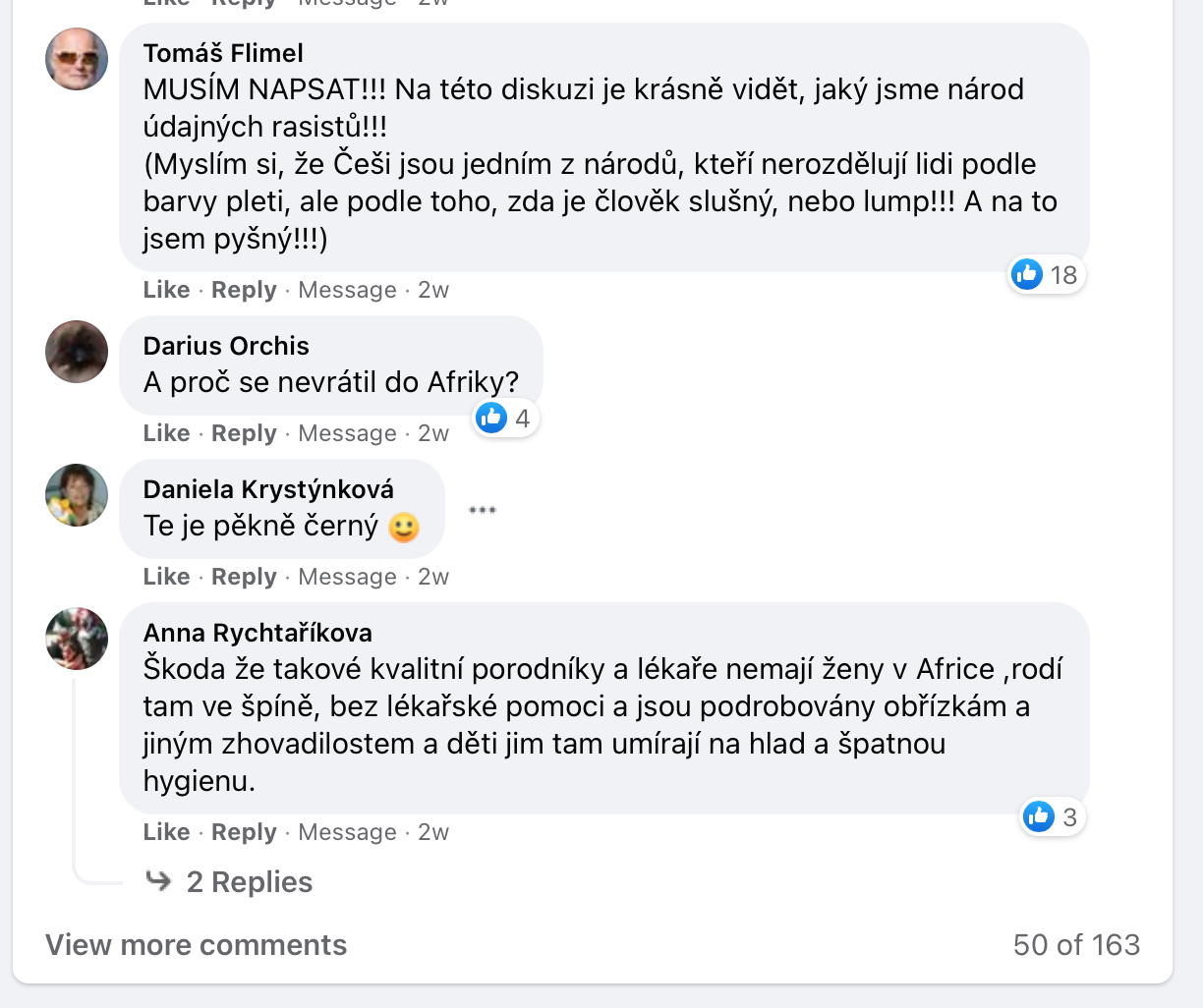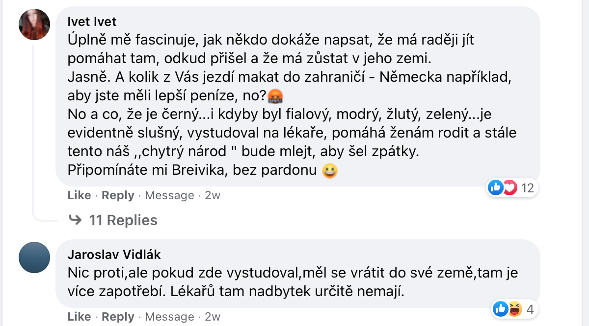 The commenters split into two groups immediately, with one of them evaluating the personal and professional qualities of the doctor while not caring about the colour of his skin at all, and the other one up in arms. Comments saying the baby delivered will immediately be frightened by him, or asking why is he in our country instead of treating people in his home country, which is Ghana, appeared. The biggest paradox was when our editor Karolína asked the doctor whether he felt xenophobic elements in the Czechs and whether he himself encountered them, he answered unequivocally and without hesitation that no, he had never encountered it and had no problem with it here. So how is it then? And what are we afraid of or displeased with?