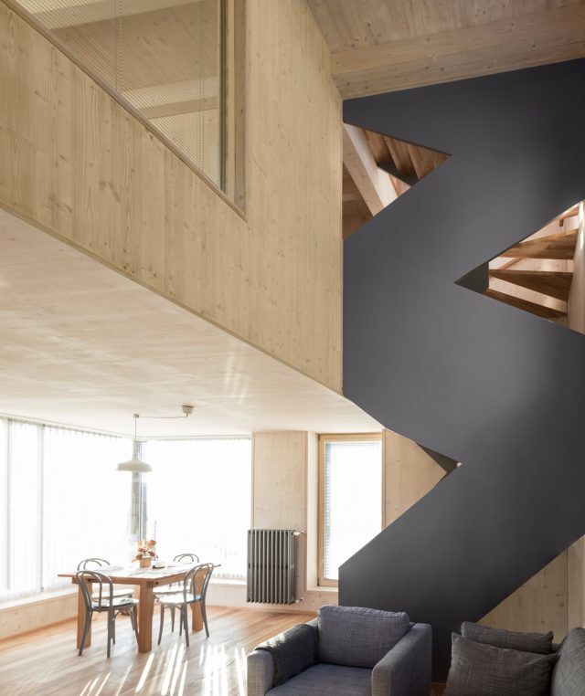 The interior dominated by light shades is luxuriously and tastefully furnished. The exterior and interior is made of spruce, using bleached bio-impregnated plates. The owner likes to watch nature, so the architects designed his own observatory on the top floor.