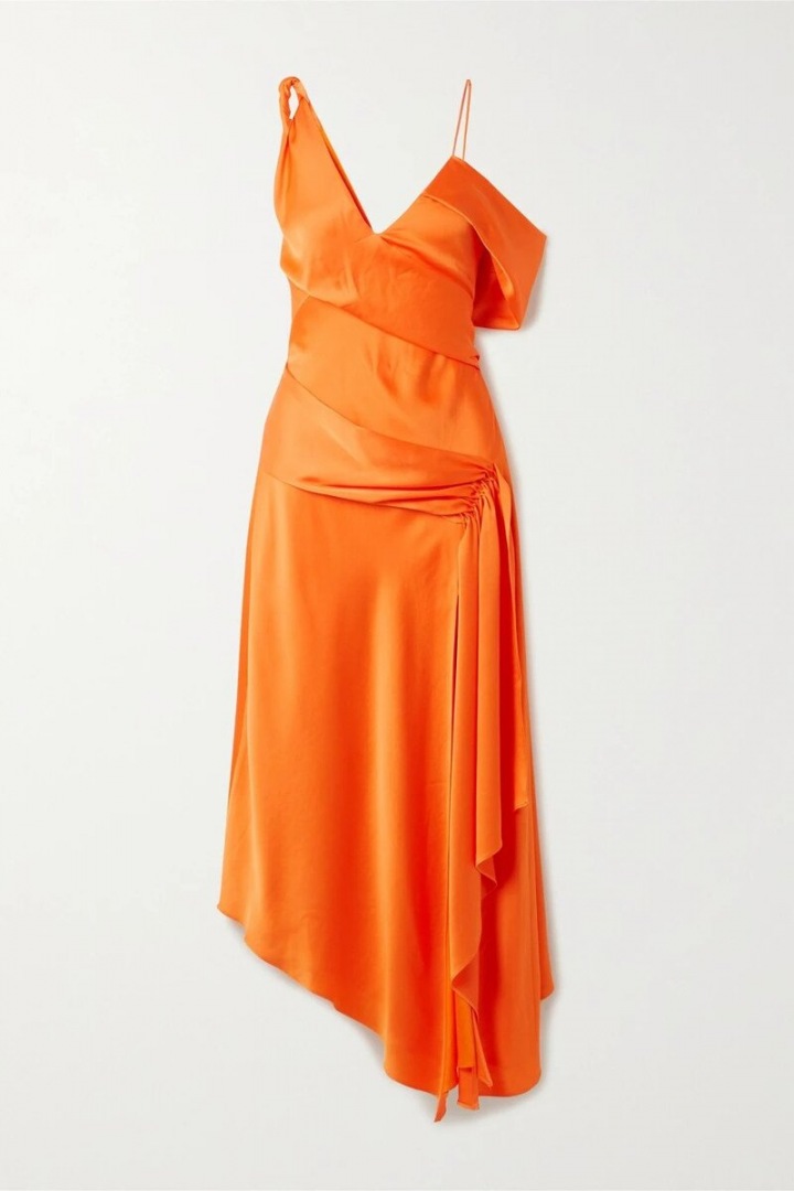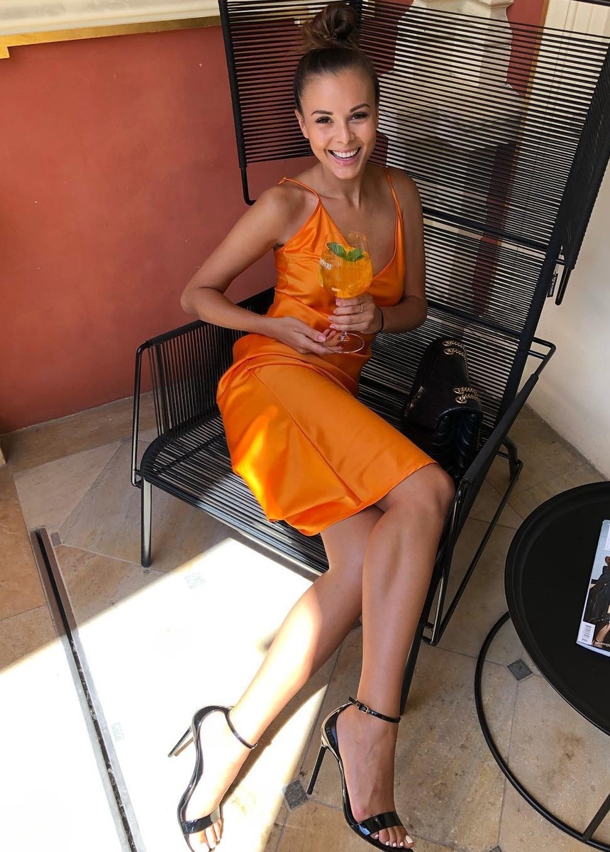 Ride the summer wave and put on a minimalist satin dress in a distinctive shade of orange, just like Monika. This model by designer Jonathan Simkhai, for example, will make your body look amazing. Complete the outfit with luxury Saint Laurent pumps and a pochette adorned with gold from the same brand. All you need now is a drink, then you'll be able to fully enjoy the feeling of being the most stylish woman in the room.