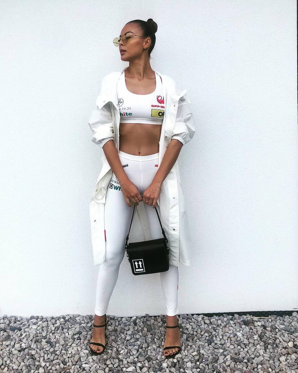 Elastic leggings and a sports bralette in combination with stilettos? Not only yes, but HELL YES! Monika knows well that this combination is so hot that it will make the hearts of everyone around her beat faster. You too should bet on a sophisticated outfit like from the backstage of Formula 1 by Off-White, which you can complete with a handbag from the same brand, luxury Stuart Weitzman stilettos, a stylish Jil Sander parka and Oliver Peoples sunglasses.