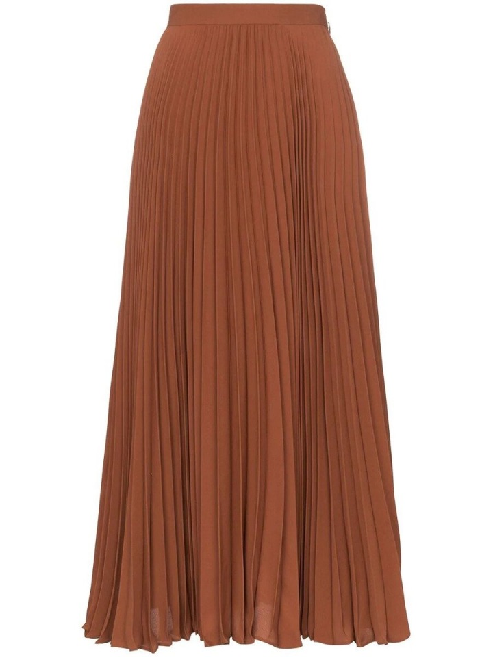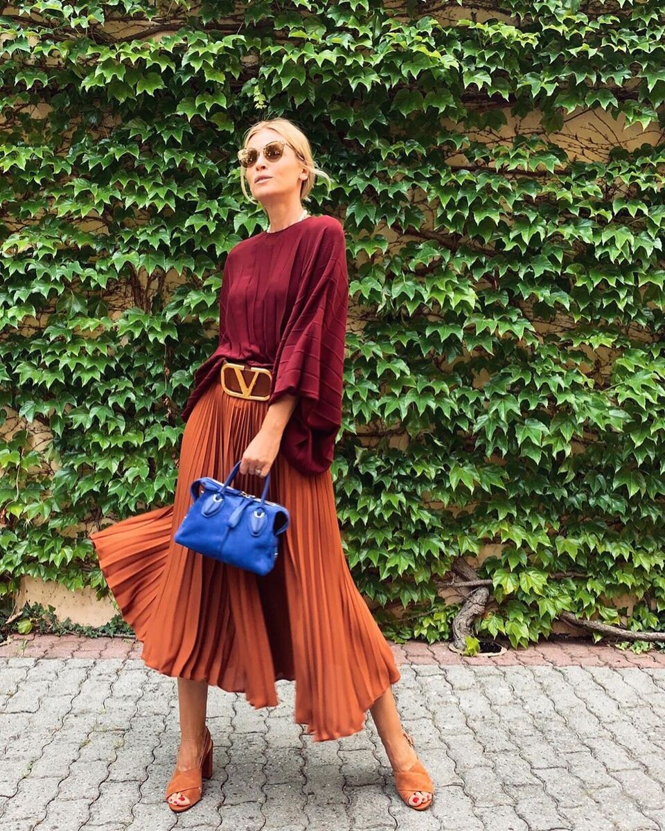 Daniela dressed almost from head to toe in luxurious Valentino pieces. The basis of her outfit consists of a brown pleated skirt complemented by a belt of the same shade, a top with gathered sleeves, brown heeled sandals and a handbag in a beautiful shade of royal blue. Don't forget that the color of this year is classic blue. What better time to sport it than right now?!