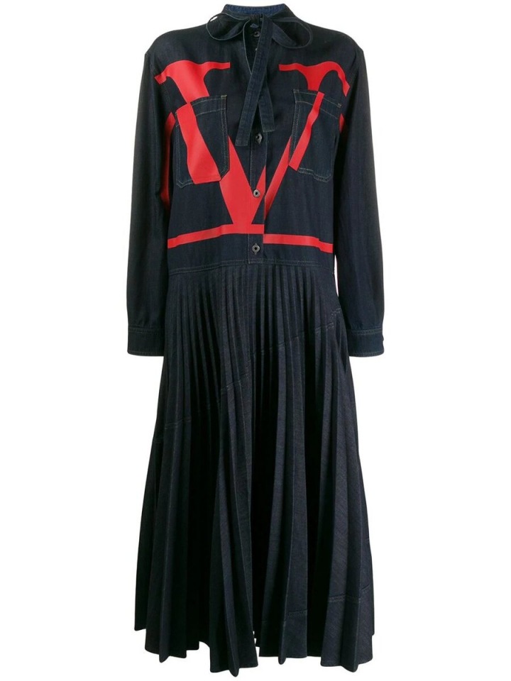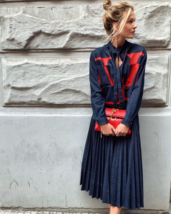 Do you prefer timeless denim? Then follow Daniela's example and wrap your body in a comfortable denim dress with a stylish tie on the neck. Complete the outfit with a luxurious red handbag with gold accents.