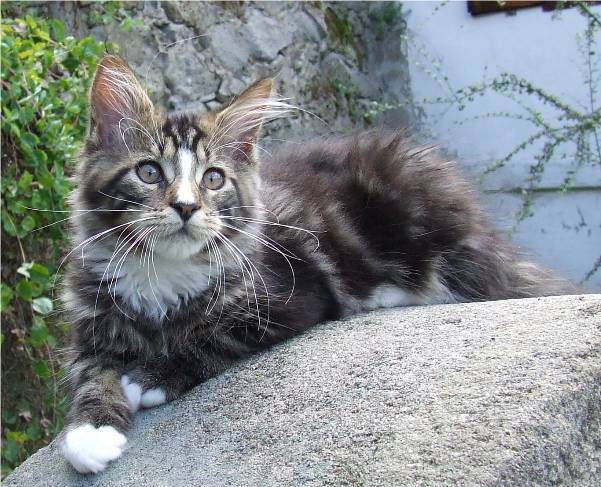In addition to its robustness, the Maine Coon also owes its "wild" appearance to its long, thick and flowing fur, which forms an abundant ruffle around the cat’s neck. This luxurious cat’s coat can have many different shades from black through red, white, blue and creamy with or without markings, to silver. The most common color is marbled brown. It has many nicknames, such as "dog cat" or the above mentioned "gentle giant".