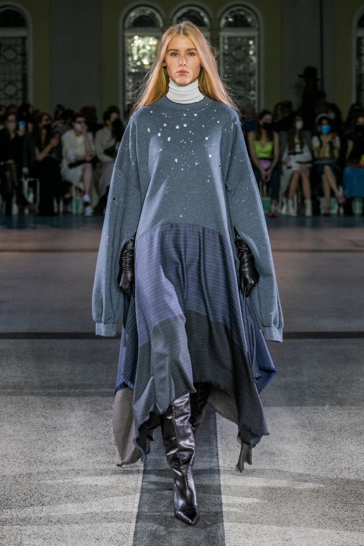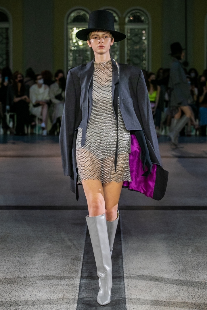 Jakub worked mainly with materials that were traditional as well as luxurious. Playfulness, lightness and freedom permeated the whole collection. The fact alone that at the end of the show, the otherwise serious models began to smile and dance to the song Freedom by George Michael, said it all. Personally, I was fascinated by the combination of an oversized gray jacket with high boots and a pleated dress. And that hat? Simply beautiful. I can imagine going to both a party and a business meeting in this outfit. I applaud you, Jakub!