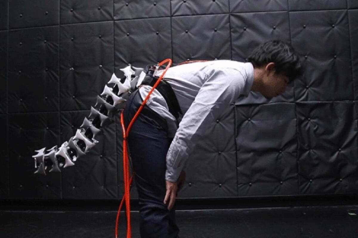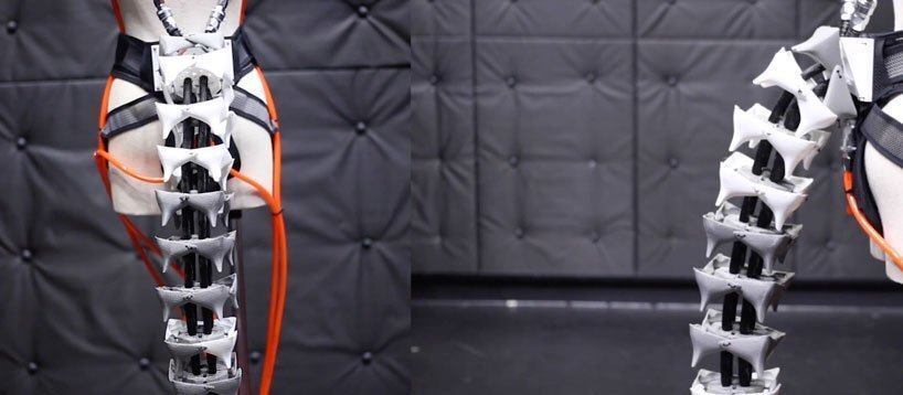 The Arque consists of interconnected plastic vertebrae which move on the basis of compressed air. Each spine joint is formed by a central plate surrounded by four additional protective plates, connected by elastic cords. The robotic tail can be attached around the waist and adjusted as needed according to a person's weight and height.