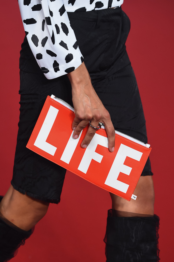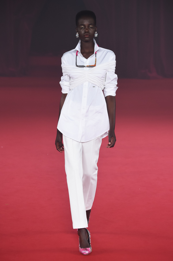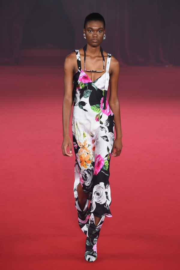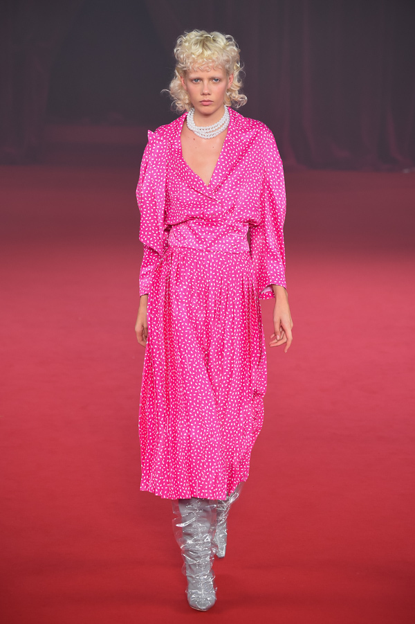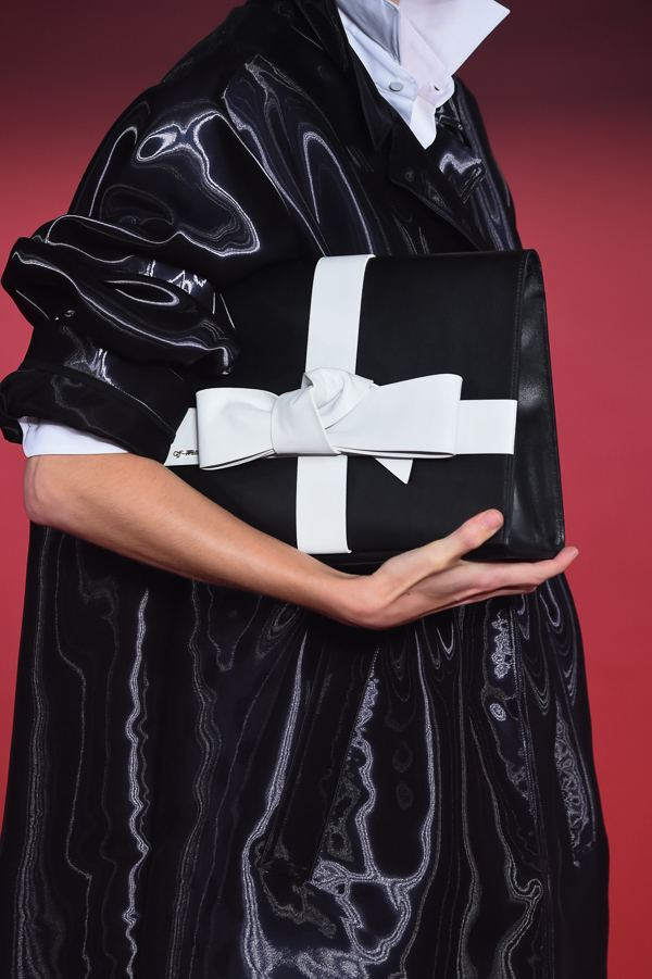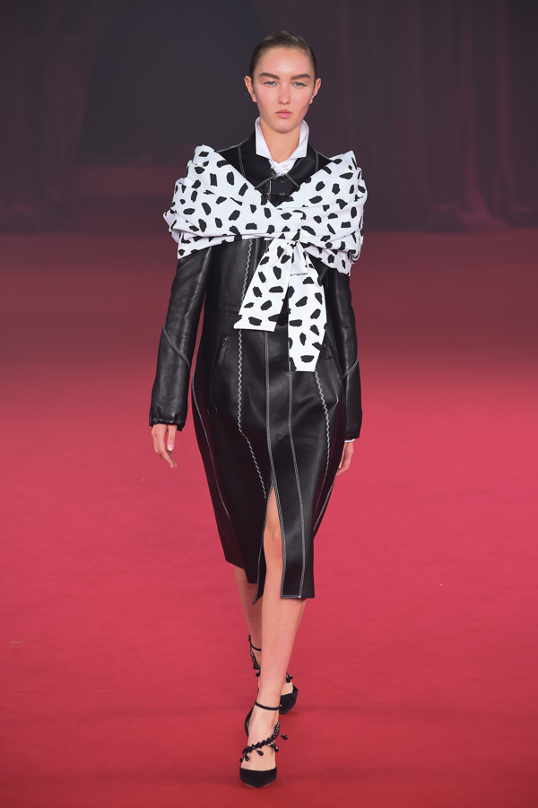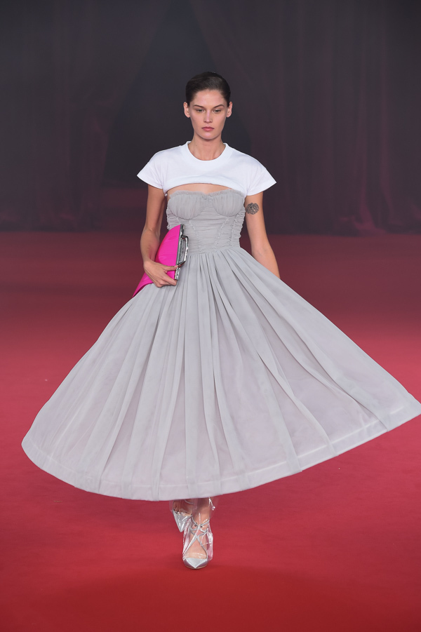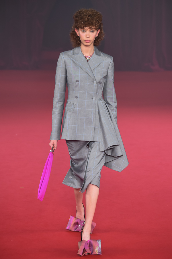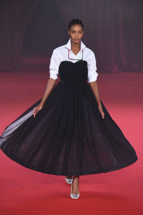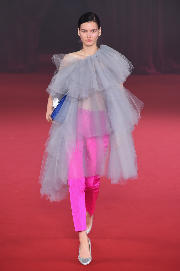 Apart from floral patterns or polka dots, the collection is also dominated by tulle, satin and leather. What things do we like? The black and grey corset dress with a luxuriously wide skirt. On the contrary, we regard the grey pleated suit in combination with high heels with a maxi-bow and weird elongated handbag as a mistake.