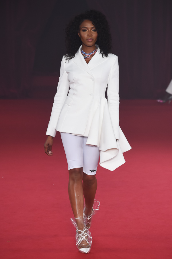 The SS 2018 collection is inspired by the beloved Diana, Princess of Wales. Apart from classic items such as beautiful suits in pastel pink or blue which won us over with their simplicity, Virgil Abloh decided to also reach for less formal outfits. The supermodel Naomi Campbell wore a luxurious white jacket in combination with cycling shorts and we also saw leather trousers on the catwalk as well as a denim outfit which the princess wore to society events during her lifetime.