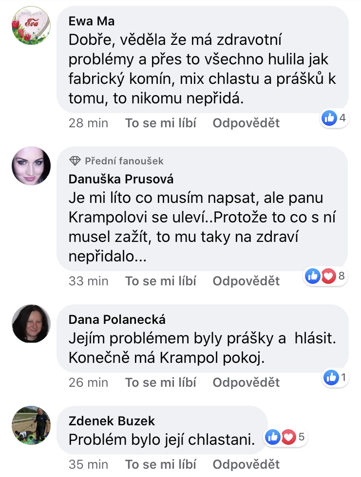 he says firmly. If you expected a flood of condolences, you couldn't be more wrong. A considerable number of the people commenting on Facebook have a strong opinion about the death of Jiří Krampol's fourth wife.