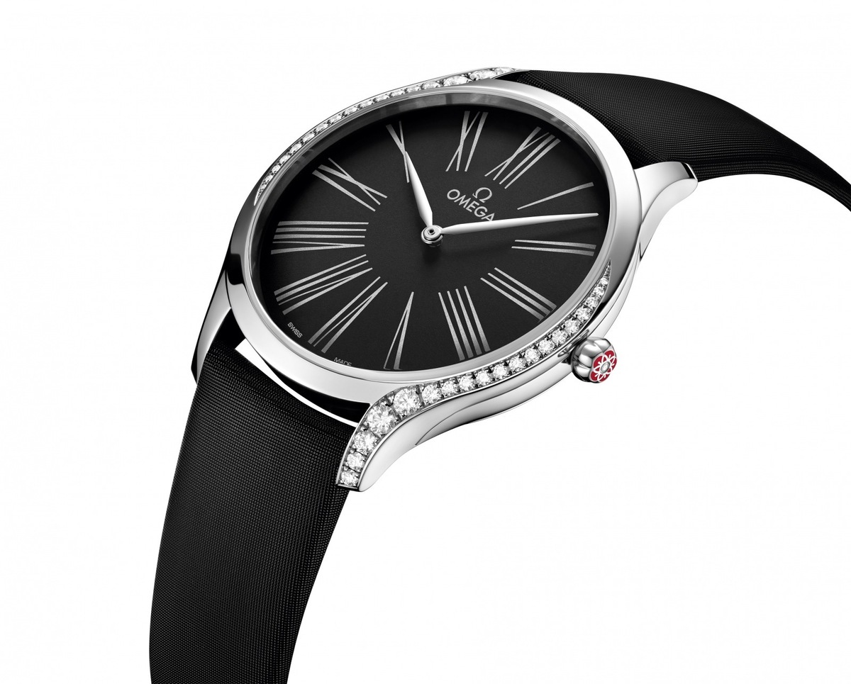 The curves along each side of the body are fitted with diamonds; one diamond is set in the crown and surrounded by a flower made of red ceramic. The dial is elegant, with luxurious fine roman numerals. On the back, all the watches feature a special mirrored crown with the “Her Time” motif.