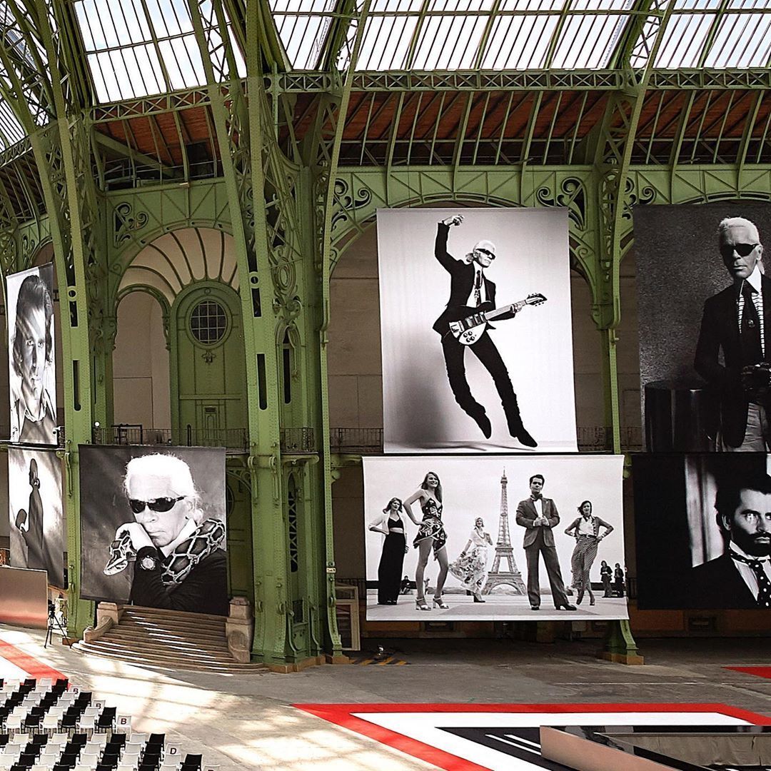 The walls of the Grand Palais were decorated with black and white as well as color portraits of Karl Lagerfeld, mapping his journey from the very beginning, when he won the international Woolmark Prize as an unknown young designer in 1954, through his work in the luxurious fashion houses Chloé, Fendi and Chanel, to the last years of his life.